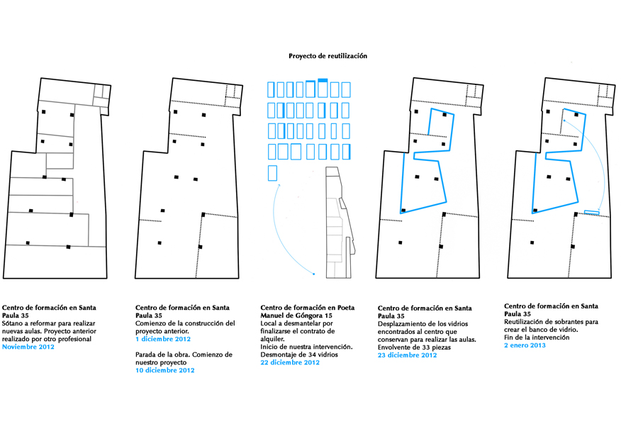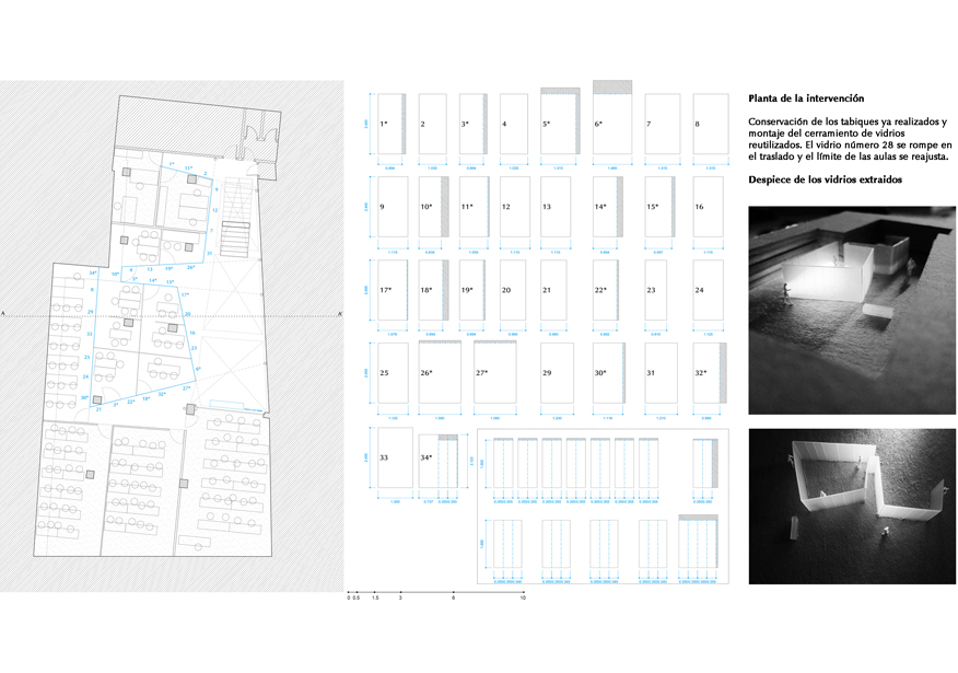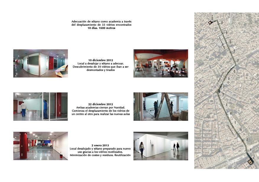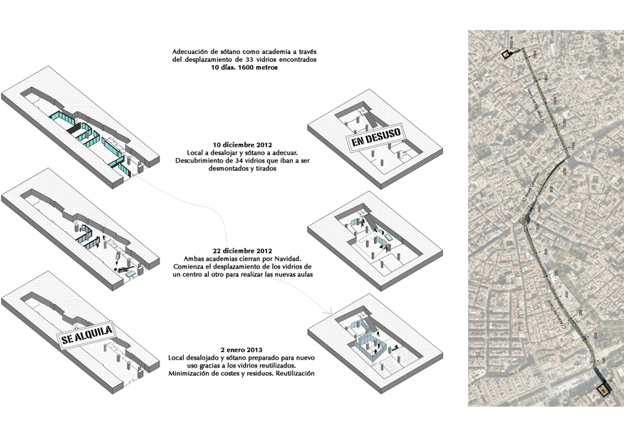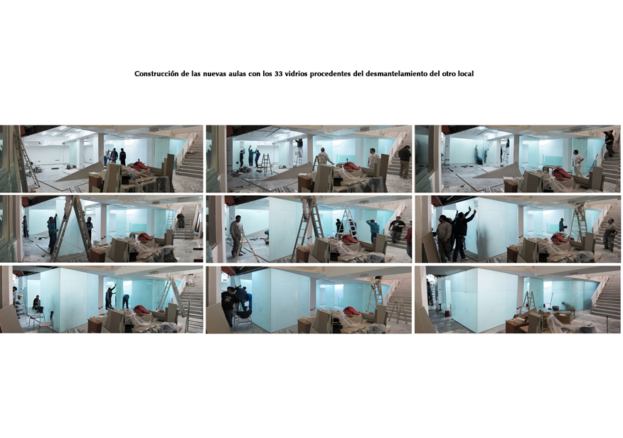 Ayudando en la limpieza del local debido a nuestro vínculo personal con los propietarios de la empresa, descubrimos que en la academia a punto de ser desmantelada existían 34 vidrios translúcidos, dispuestos como cerramiento de las aulas. Estos vidrios iban a ser desmontados y tirados, mientras que para ampliar el programa docente del local que conservaban pensaban comprar e instalar paneles de cartón-yeso.