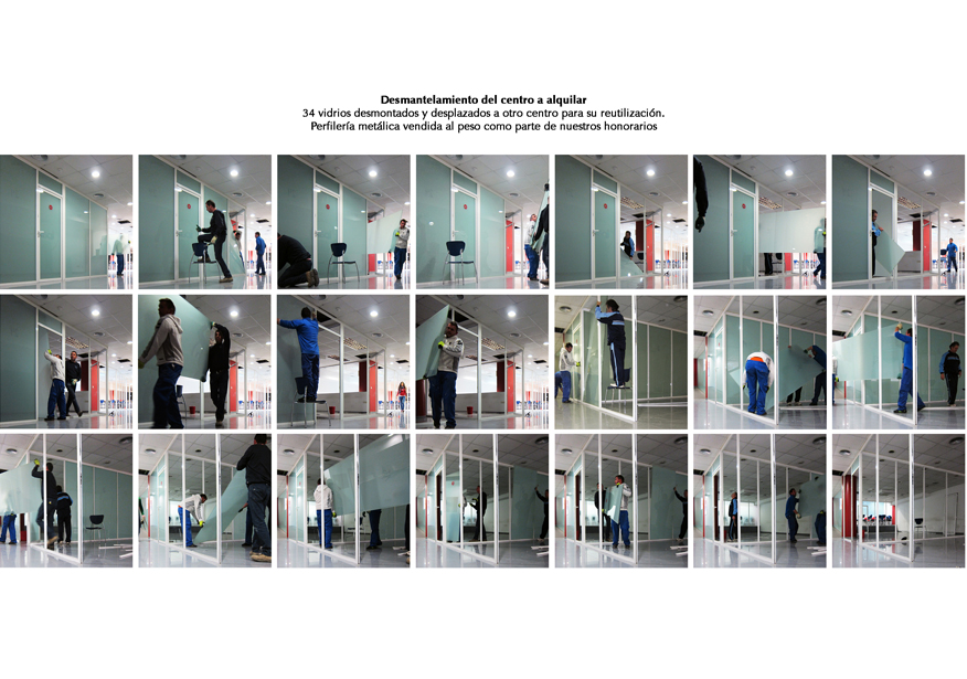 Con este procedimiento no generamos ningún residuo en el desmantelamiento del local alquilado, reutilizando todo lo que encontramos. Los perfiles que sujetaban los vidrios, que nosotros no podíamos reutilizar para el proyecto, fueron desmontados por nosotros mismos y vendidos al peso a una chatarrería cercana para su reciclado. El dinero que obtuvimos de esta venta fue parte de los honorarios por el proyecto.