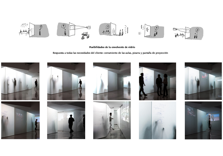 Puede que los paneles de policarbonato desaparezcan temporalmente del interior del pliegue de vidrio, funcionando éste como un único aula, como dos, o bajo cualquier configuración requerida, adaptándose el proyecto a cualquier situación y dando lugar a una experiencia distinta en cada una de ellas.