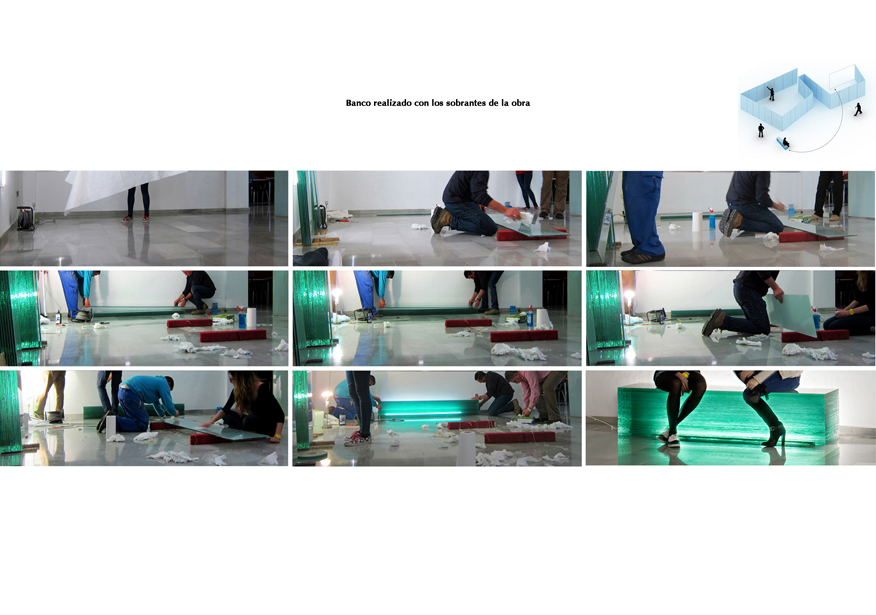 Durante la obra uno de los socios decidió que no quería vidrio en su despacho, por lo que hubo que desmontar 4 piezas. Pensamos en un uso alternativo para las mismas, no sólo con el fin de no generar ningún residuo, sino también para continuar el proceso mediante el cual los objetos no tienen un final predefinido sino que podemos reformularnos hasta el infinito dando lugar a nuevas historias y reconfiguraciones, que además de económica y energéticamente óptimas, nos resultan de gran interés ya que asumen resonancias de sus vidas anteriores. Finalmente los 4 vidrios sobrantes fueron cortados y apilados formando un banco, de forma que los alumnos de la academia ahora se sientan sobre los vidrios entre los que daban clase en el local que dejaron.