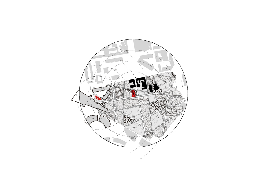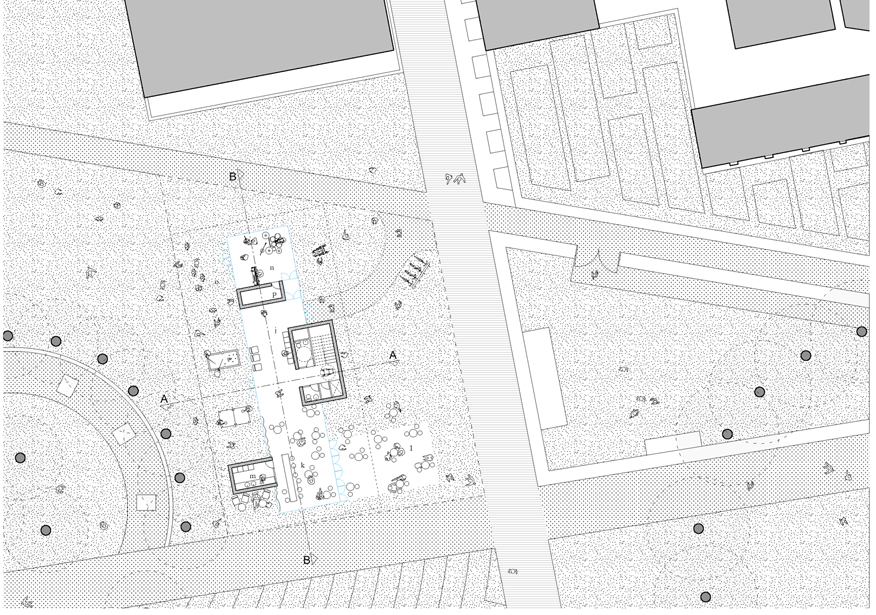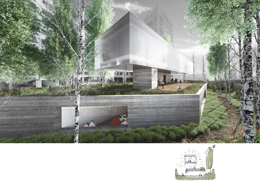 L’area oggetto del concorso è situata in una zona caratterizzata da costruzioni dal grande impatto visivo: torri, parcheggi e condomini privati sono elementi dominanti dello scenario che si presenta all’osservatore. L’obbiettivo del progetto è dunque la creazione di un giardino chiuso, un “hortus conclusus”, che possa isolare il nuovo padiglione infantile dagli edifici che lo circondano e che, al contempo, lo connetta fisicamente e concettualmente al vicino parco.