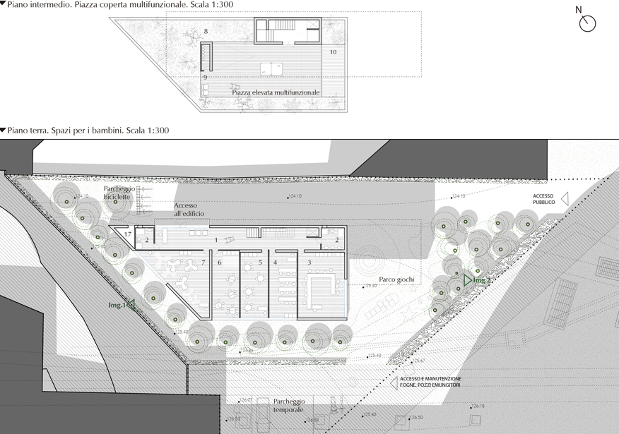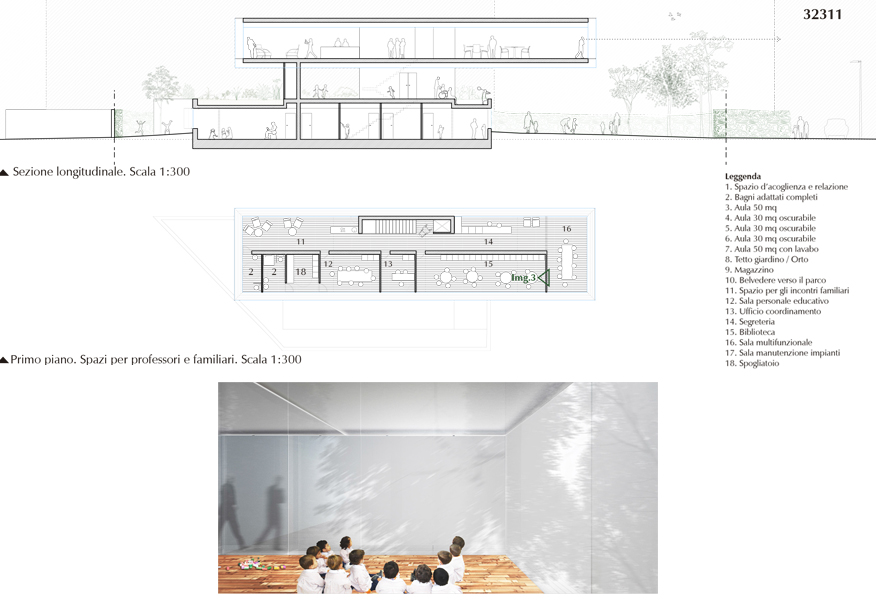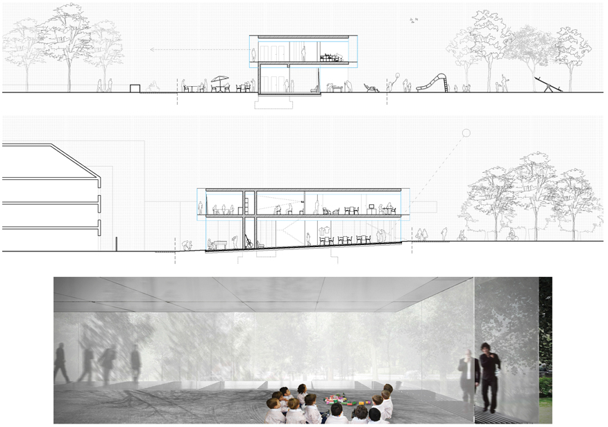 L’edificio è pensato su tre livelli. Il piano terra, porzione maggiormente “pesante” della costruzione, è suddiviso in due aree funzionali: una che contiene le aule richieste (due di 50mq e tre di 30mq) e un’altra con le zone di passaggio, relazione e servizi, organizzate in modo da minimizzare la superficie destinata ai corridoi. Il livello intermedio funziona come una “piazza” elevata semicoperta, uno spazio multifunzionale per lo svolgimento delle attività nei giorni di pioggia, per il cinema all’aperto o per riunioni. La piazza è circondata su tre lati da piante e ciò comporta una connessione concettuale con il parco costituendo così un ambiente intimo e al contempo aperto visivamente all’area verde a est. L’ultimo piano infine, è destinato ad educatori e genitori e a livello funzionale è organizzato come il piano terra: con aree di relazione, riunione e circolazione da un lato e uffici, biblioteca, sala multifunzionale e sala professori dall’altro.