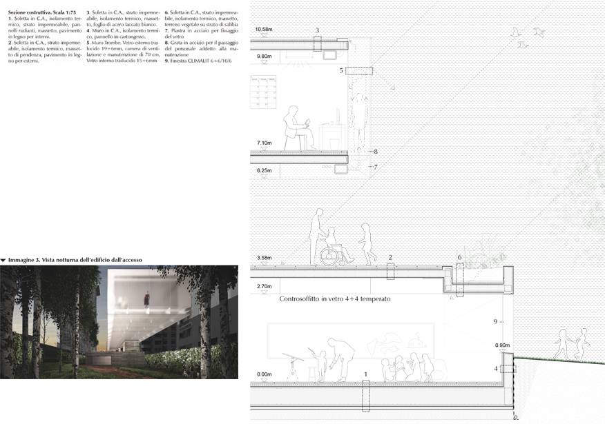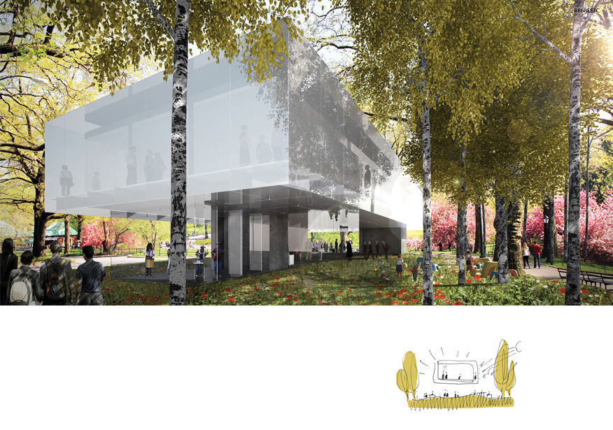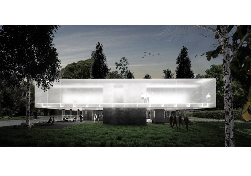 La costruzione contenuta all’interno del giardino vuole essere una struttura leggera, in contrapposizione ai fabbricati confinanti, riconoscibile come edificio di uso pubblico grazie ai materiali impiegati e alla sua configurazione. L’acceso al padiglione si ricava dal prolungamento di uno dei percorsi del parco, in modo da rendere la nuova costruzione parte integrante dell’area verde che la circonda. Il parco diviene così anticamera del padiglione, da qualunque direzione si provenga. Si prevede anche l’utilizzazione della strada di accesso al podio per rendere l’area raggiungibile ai veicoli, che potranno così sostare temporaneamente al sito.