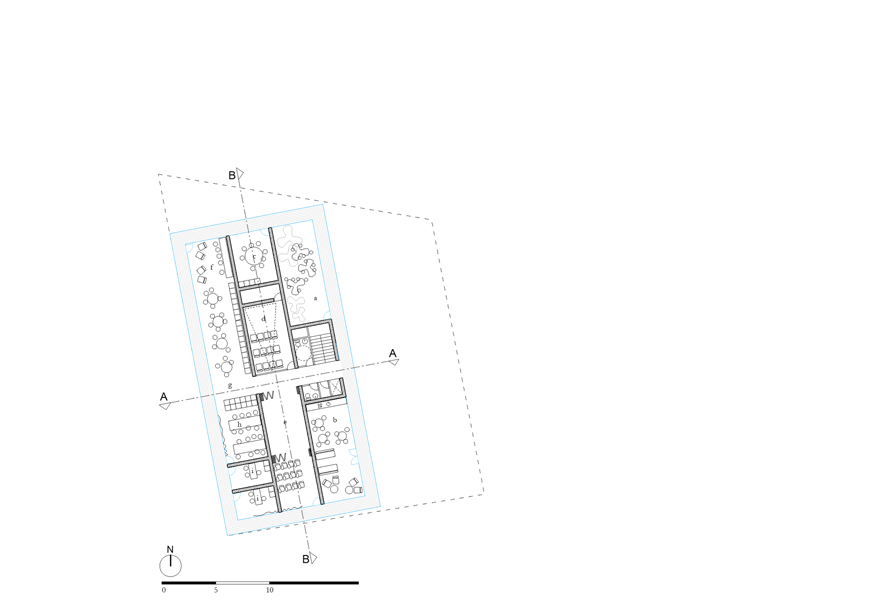 Il giardino è pensato per avere due zone d’ombra, una dovuta all’edificio stesso e un’altra in prossimità di un piccolo boschetto di alberi che si vuole far nascere nella parte sud est dell’area, la zona maggiormente adatta alla piantumazione. A sud ovest del lotto si piantuma invece un unico filare di alberi, rispettando i 3 metri di distanza dal confine suggeriti dalla normativa, per stabilire un filtro tra il padiglione e gli edifici confinanti. Sul confine si pongono una rete metallica e una siepe cui altezza e spessore variano a seconda degli elementi architettonici che si trovano lungo il perimetro di confine.