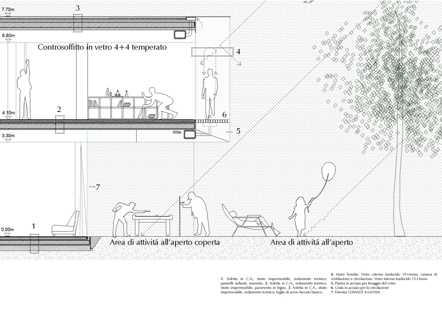 Il progetto ha come fine ultimo i bambini attraverso la percezione e il contatto con elementi naturali e atmosferici come la vegetazione o la luce naturale. La doppia vetrata che circonda questo piano riflette la vegetazione che circonda l’edificio, permettendo allo stesso tempo la percezione visiva dall’esterno delle attività che si svolgono all’interno, in un gioco di riflessi e ombre che lo integrano nel sito e lo dotano di un carattere speciale, fortemente vincolato alla natura di questo spazio. All’interno, la luce naturale che filtra attraverso le vetrate traslucide, favorisce il costituirsi di un ambiente calmo e armonioso, la cui illuminazione risulta ideale per lo svolgimento delle attività di ogni tipo. Con questa soluzione, non sarà necessaria luce artificiale nelle ore diurne. La sera poi, l’illuminazione interna farà in modo che l’edificio dia la suggestiva sensazione di essere una sorta di lanterna incastonata tra gli alberi. Luci a basso consumo tra gli strati di vetro, illumineranno gli ambienti in maniera da lasciare la sensazione a chi sta all’interno di essere come immerso in una “cassa di luce”.