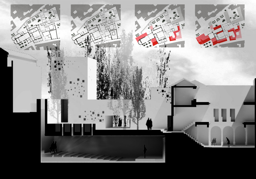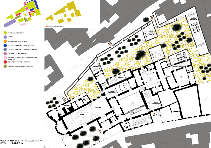 El proyecto propone suprimir las actuaciones de finales del S.XX y plantea una nueva pieza a modo de ampliación que surge con el propósito de reconciliar los HUERTOS originales recuperados del antiguo convento con el barrio circundante. La intención es la de no intervenir únicamente a través de la arquitectura, sino que los vecinos tomen parte de este nuevo espacio, de manera que pase de ser privado a público, disponiendo zonas de transición y usos mixtos. De este modo la ampliación del convento se plantea desde un enfoque más amplio, desde la implicación de un barrio con sus espacios abiertos y productivos.