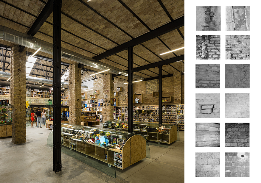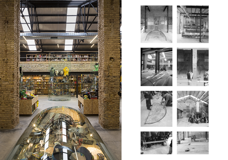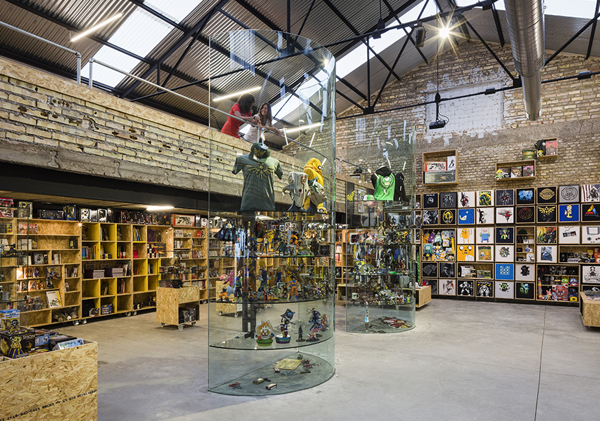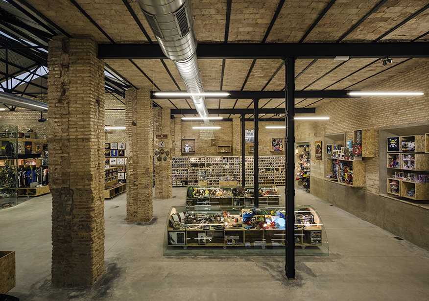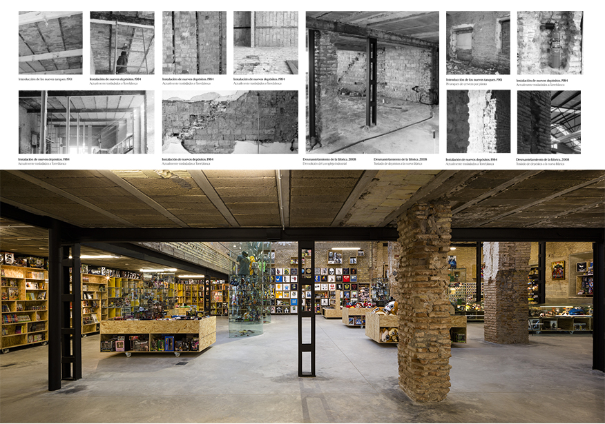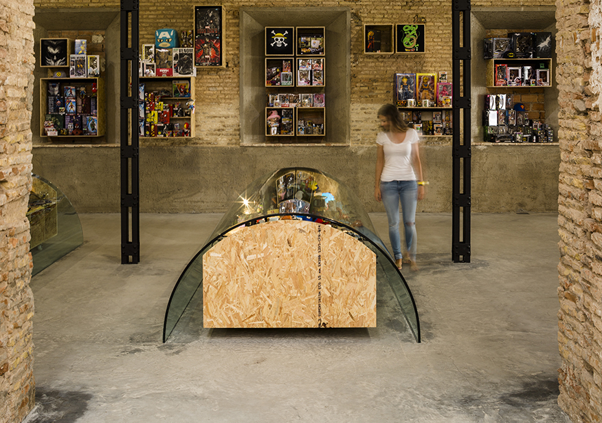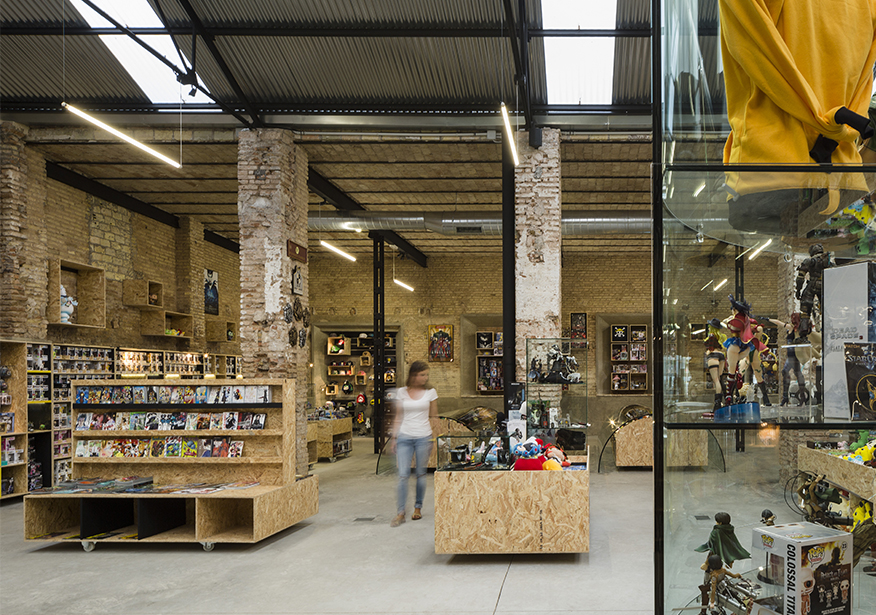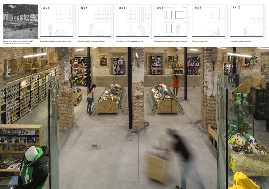 Una vez recuperada, la nave se ocupa con una nueva actividad. Una tienda de comics y espacios de lectura y ocio que cuenta con una serie de productos permanentes y otros temporales, se trata de un espacio más cercano a lo museístico que a una tienda convencional. Desplazando el imaginario tan cercano de la fábrica de Cruzcampo y la colocación de sus tanques, consideramos oportuno asociar la exposición del producto permanente a una serie de tanques de vidrio dispuestos en diversas posiciones a modo de vitrinas que interaccionan, a través de reflejos y transparencia, con la luz, el producto y el movimiento de la gente al recorrer el espacio.