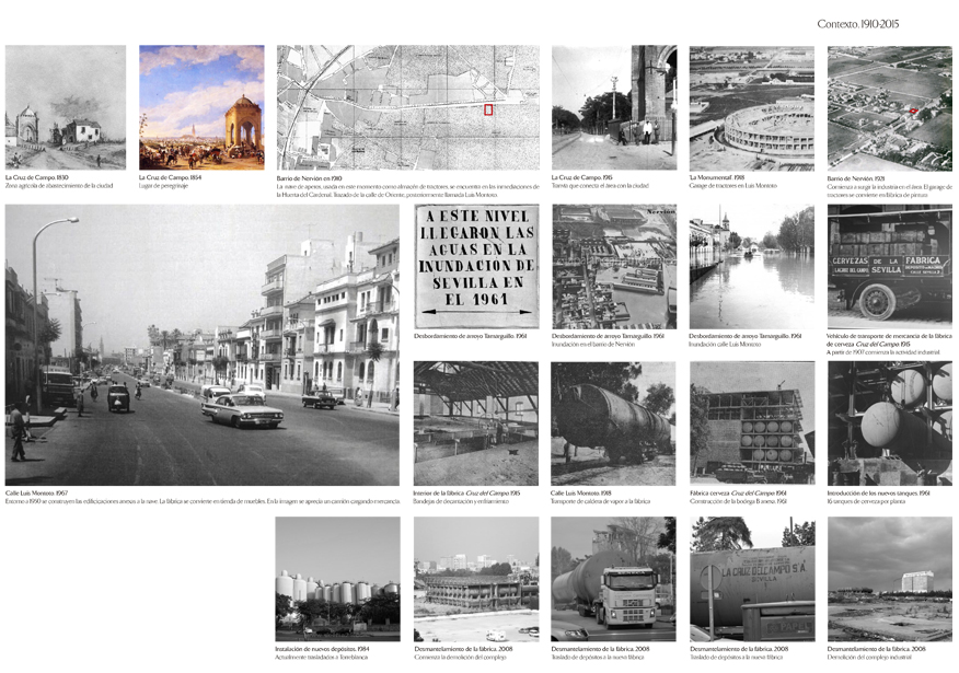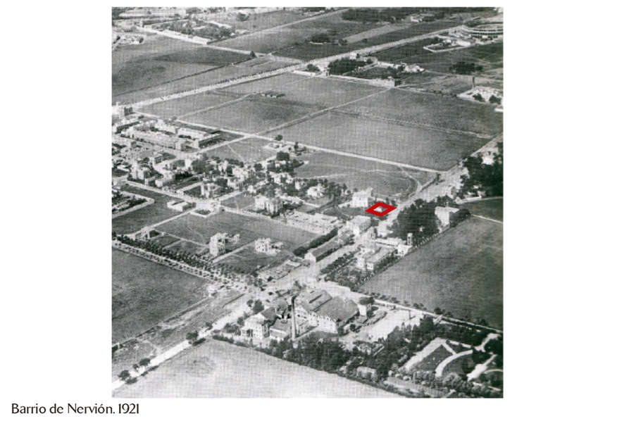 El proyecto se encuentra en el barrio de Nervión en Sevilla que, como se observa en las distintas fotografías de época y en la planimetría antigua, siempre ha tenido un fuerte carácter industrial. Fue durante muchos años el área de abastecimiento de la ciudad, con multitud de parcelas agrícolas en las que se cultivaba sobre todo trigo. Ya en 1830 existía parte del edificio objeto de intervención, construido como nave de aperos y utilizado posteriormente como almacén de maquinaria agrícola.
