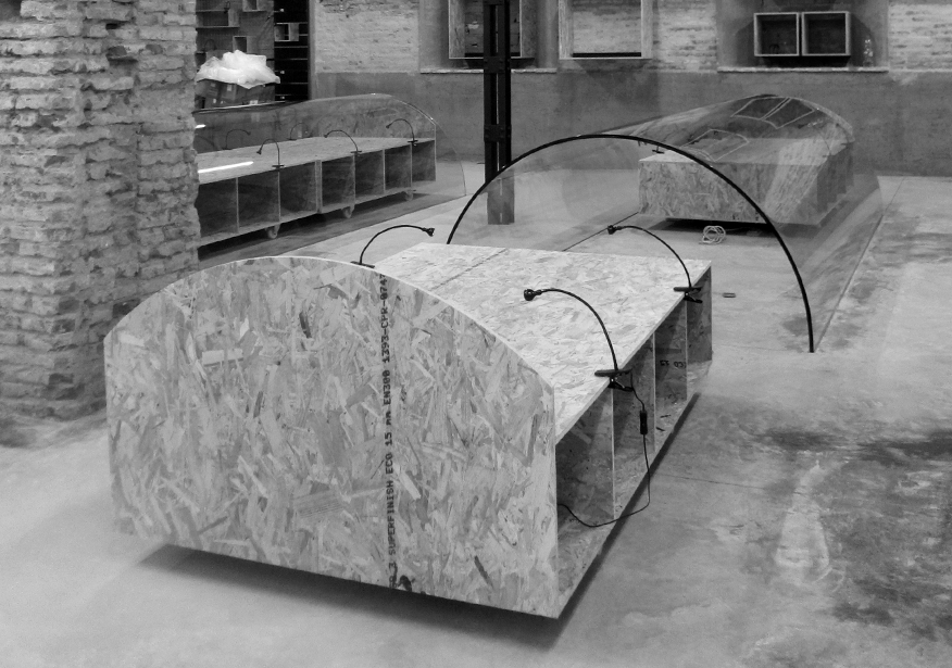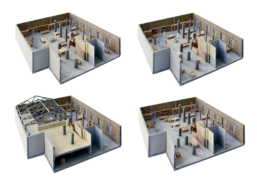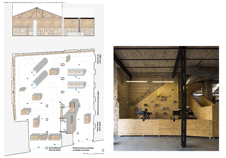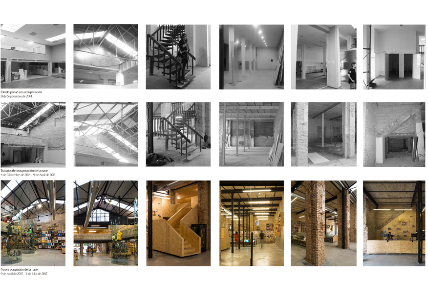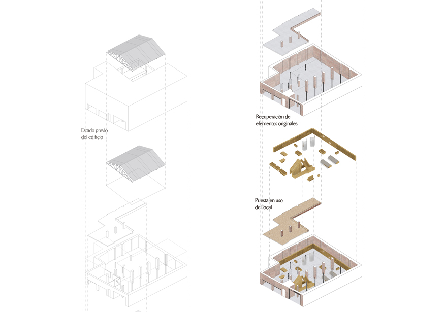 La nave agrícola había sufrido múltiples transformaciones durante su existencia, todas empeñadas en añadir nuevos elementos a los ya existentes, dando como resultado una superposición de capas que fueron deformando el espacio, compartimentándolo y confinándolo. El proyecto trata de recuperar el espacio industrial primigenio a través de un proceso que se realiza de forma natural, eliminando todo elemento accesorio superpuesto y dejando al descubierto la fábrica de ladrillo y la estructura metálica que dieron forma a la nave de comienzos del siglo pasado. Más tarde este espacio será ocupado con elementos móviles y mobiliario provisional.