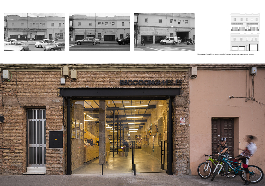 Como parte de la recuperación de la fachada original de muros de ladrillo de la nave, se descubrió un hueco que funcionó en el pasado como acceso de tractores. En la fachada se pueden observar diversas huellas de las intervenciones que ha sufrido a lo largo del tiempo. La perfilería metálica encontrada se protege pintándola de negro. La cerámica rescatada, con sus imperfecciones y paños modificados, vuelve a tomar presencia desde la calle.