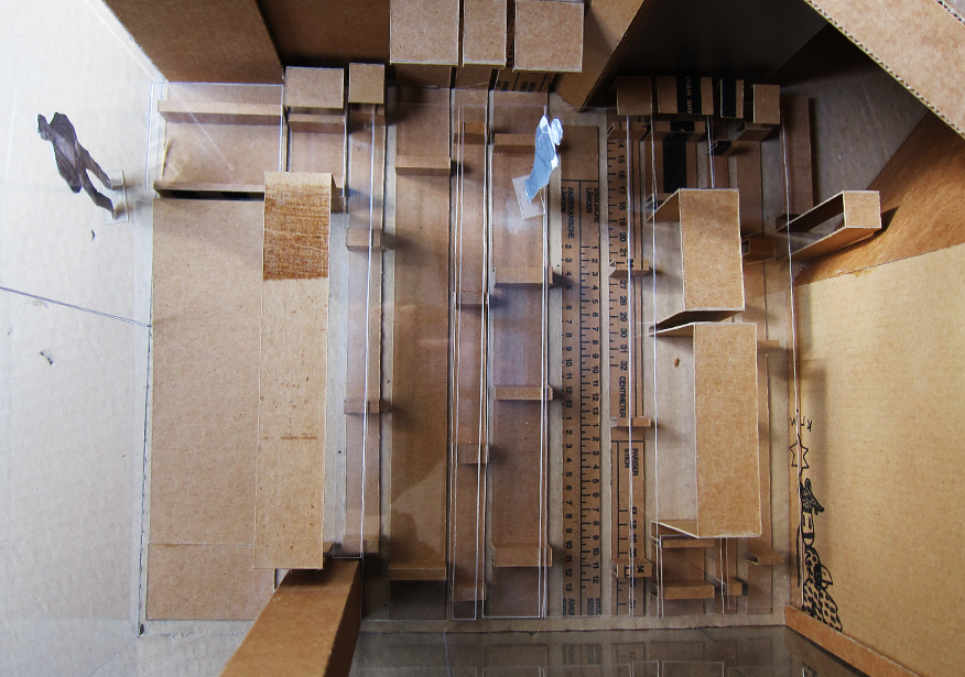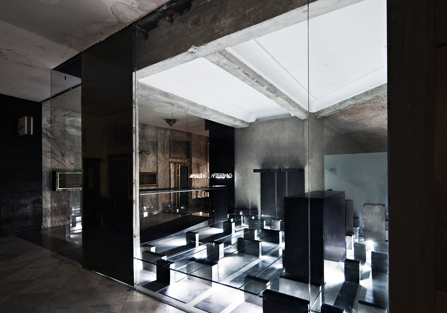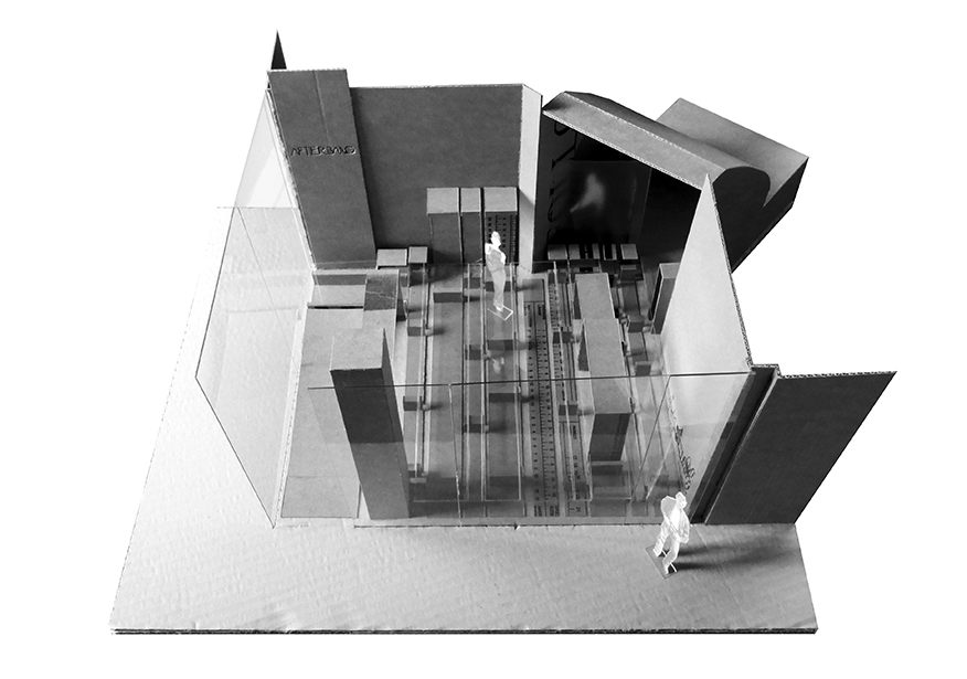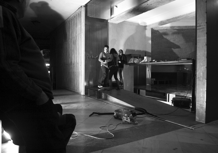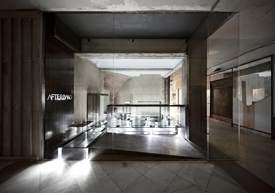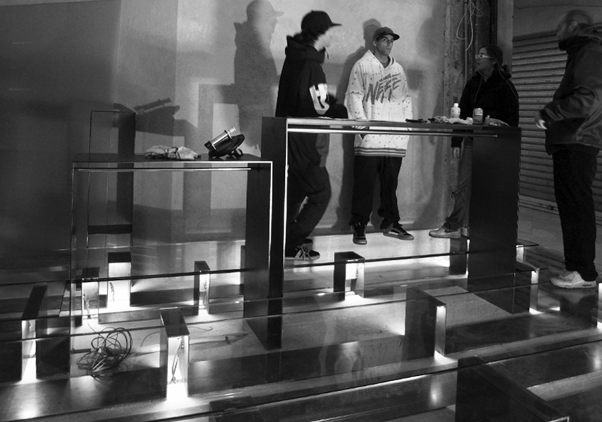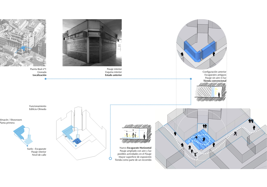 Nuestra propuesta consiste entonces en subvertir el concepto tradicional de escaparate, explorando la posibilidad de difuminar los límites entre el espacio privado y el espacio público en una tienda de ropa. De esta forma, se pueden generar intercambios entre espacios de distinto carácter. La tienda dota al pasaje comercial de aire liberando la esquina, 24 horas de luz y un programa de actividades capaz de atraer visitantes a este lugar: sesiones de música -el cliente es DJ- exhibiciones de break dance o proyecciones. El pasaje, por su parte, cede su superficie y puede ser ocupado temporalmente como extensión de dichas actividades y del área expositiva de la tienda.