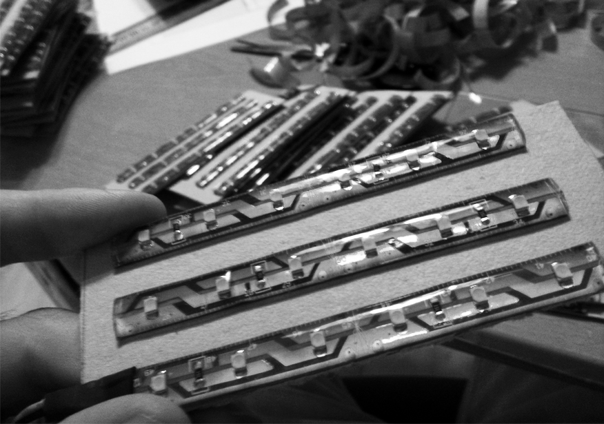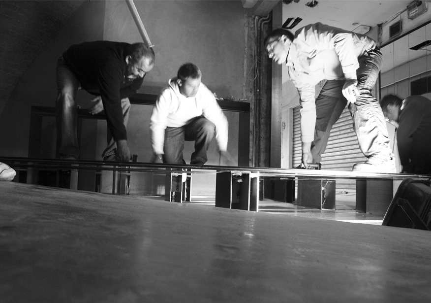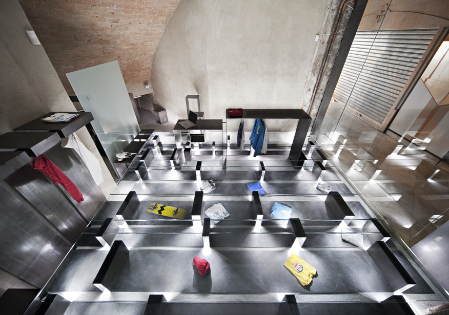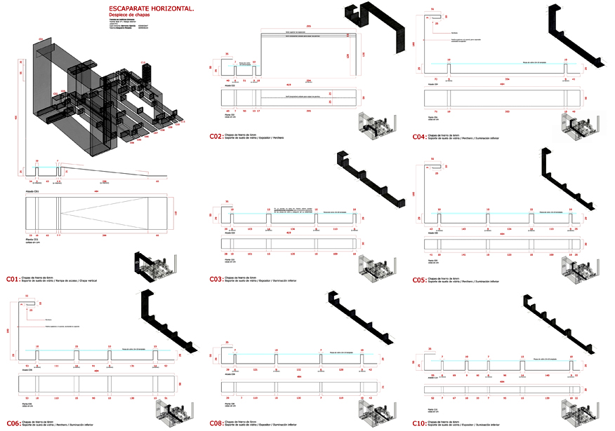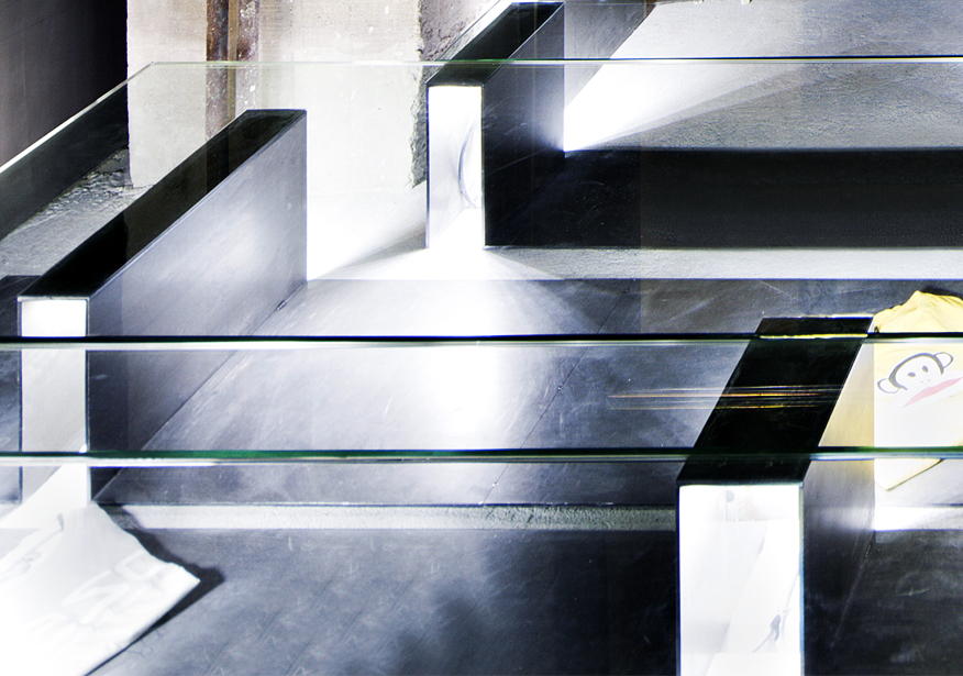 La construcción del escaparate horizontal, que acondiciona el local para su uso como tienda, se realizó con chapas de hierro de 6mm de espesor que son soporte para el suelo de vidrio, los artículos expuestos y el sistema de iluminación. Las placas de LED, que se sostienen bajo las chapas mediante imanes, los fabricamos artesanalmente recortando tiras de LED, soldándolas entre sí y pegándolas a soportes de cartón a los que habíamos adosado una tira imantada en el lado opuesto. El suelo lleva encendido desde noviembre de 2010 de forma permanente, iluminando la tienda y el pasaje generando un gasto mínimo.