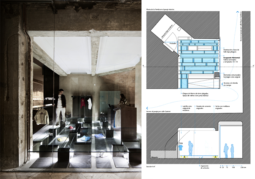 La estrategia para materializar estas ideas consiste en dos acciones: la puesta en valor de los elementos originales del edificio descubiertos en el local, recuperando su identidad, y la construcción de un escaparate horizontal que alberga los artículos en venta y permite que el espacio expositivo de la tienda forme parte del pasaje.