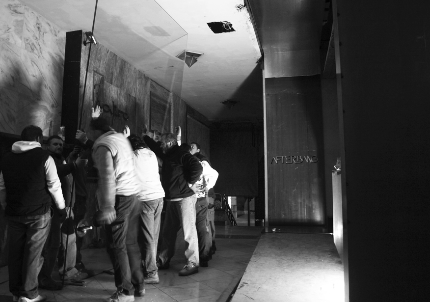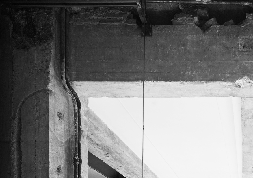 Durante los trabajos del limpieza des-cubrimos la estructura del edificio: una bóveda de ladrillo bajo la escalera principal, las vigas y pilares de hormigón armado, y unas molduras de escayola que el cliente reconoció como suyas, ya que son las mismas que hay en su casa -vive en el sexto piso del mismo edificio-. Estos elementos fueron revelados tras la retirada de distintas capas superpuestas que habían sido sumadas en cada reforma llevada a cabo en el local, reduciendo extremadamente su volumen: dos techos de escayola bajo el principal, dos muros cubriendo el pilar -uno de ladrillo y otro de espejo- , y diversos paneles adosados a los muros. A través de esta operación desvelamos capas anteriores ocultas, huellas de actividades y usos, que permiten leer la historia del local y del edificio.