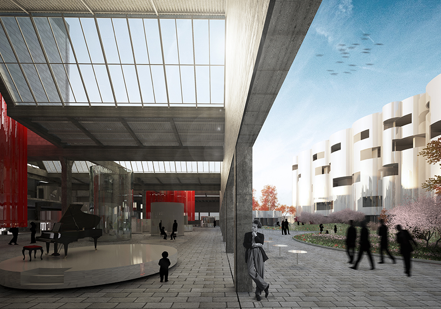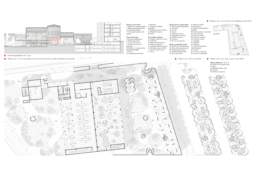 El nuevo parque contará con zonas verdes especialmente acondicionadas para la plantación de diversas especies vegetales de poco porte, teniendo en cuenta el parking subterráneo. Se plantean áreas acotadas con topografía a modo de ‘pequeñas colinas’ para albergar dicha vegetación, creando espacios de sombra y caminos, naturalizando el área y compensando la carencia de este tipo de espacios en la zona. Estará equipado para su uso intensivo a través de quioscos, tiendas de flores y una cafetería, además de asumir distintas actividades vinculadas a los programas que se desarrollan en el interior de los edificios, que podrán colonizarlo temporalmente para realizarse al aire libre.