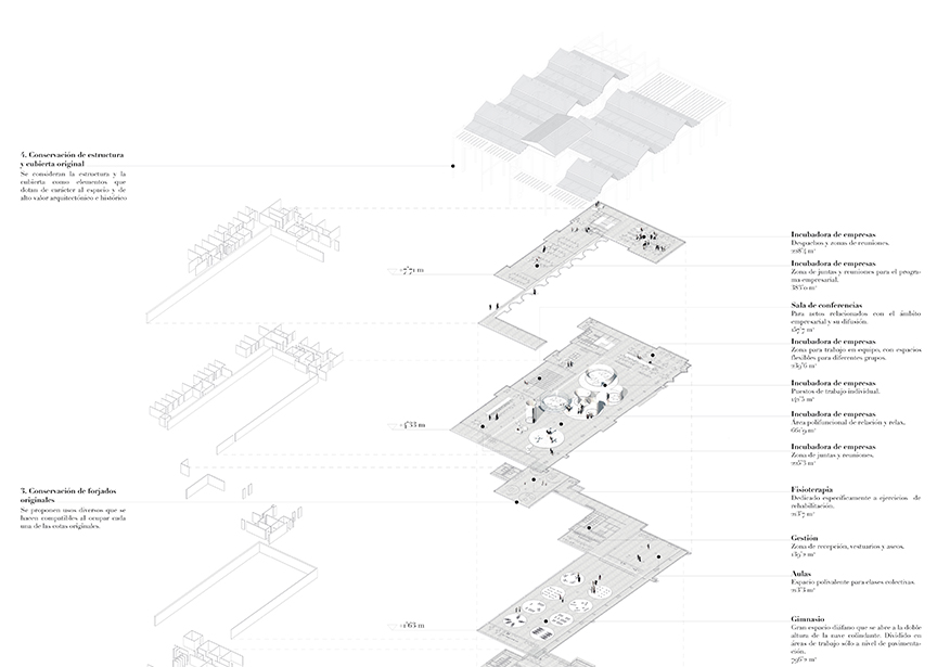 Tras una demolición controlada de los espacios accesorios y no protegidos por no pertenecer al proyecto original, se procede a una exhaustiva rehabilitación de los elementos estructurales y constructivos de la misma, desde los pilares o cubiertas hasta los pavimentos o barandillas. Una vez recuperado el carácter esencial de los espacios, es decir, su estado primitivo, se procede a ocupar este gran contenedor con otros contenedores, siguiendo la lógica industrial con la que se ha operado durante tanto tiempo en este lugar. A través del material, como se verá más adelante, y de esta forma de ocupar se pretende realizar una intervención en continuidad con lo existente. Al igual que los grandes depósitos de leche y las lecheras de aluminio ocupaban el gran contenedor diseñado por Alejandro de la Sota, los nuevos usos introducidos se encuentran en contenedores más pequeños que permiten que el edificio albergue una gran diversidad de actividades. El programa, mixto y variable, se desarrolla entonces tanto en el interior de estos contenedores como en los vacíos resultantes, dando uso a la totalidad del edificio en base a un gradiente de privacidad. Los contenedores se benefician de la protección de la nave y reciben su luz, durante la noche serán estos los que inunden de luz el espacio y se conviertan en hitos dependiendo de cada ocasión. En ocasiones solamente basta con disponer unas superficies a modo de alfombras de aluminio sobre el pavimento actual para delimitar ámbitos, o de suspender cortinas traslucidas aprovechando la altura del espacio para generar gradientes de privacidad o acondicionar acústicamente espacios más acotados.