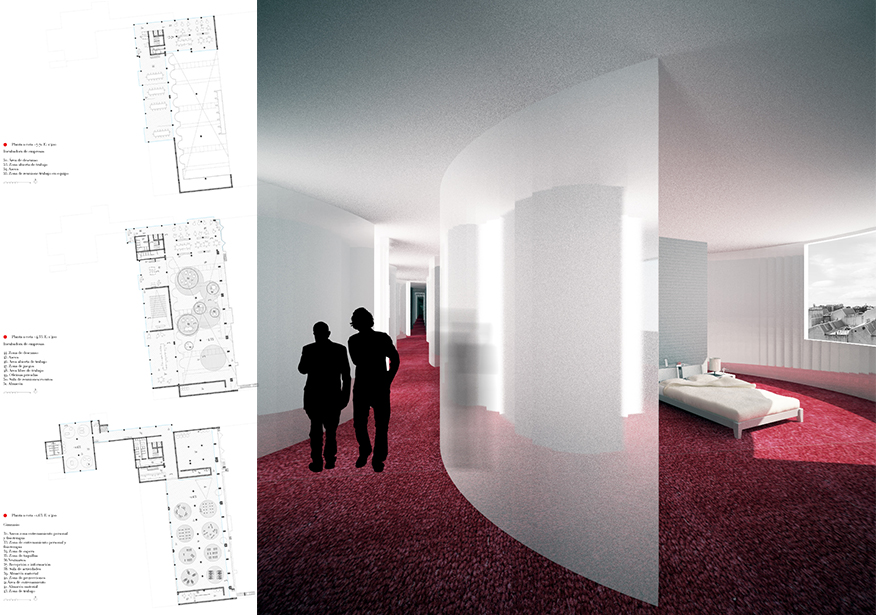 El volumen que acoge al hotel se presenta como una serie de depósitos de aluminio cepillado anodizado, en referencia al apilamiento de contenedores que se producía en el interior de la fábrica. De esta forma, parte de la antigua Clesa sale al exterior para mostrarse a la ciudad. Los depósitos-hotel pasarán a formar parte de un paisaje urbano híbrido que contiene en cierto modo y mantiene actualizada la esencia de este lugar tan singular. La forma resultante de este proceso de abstracción permite la posibilidad de ofrecer en el hotel unas habitaciones especialmente generosas y particulares que, junto con su peculiar aspecto, contribuyen a generar un valor añadido en el conjunto. Este hecho repercutirá positivamente a la hora de pensar en la rentabilidad de la operación. Creemos que utilizando un modo de hacer propio de la antigua fábrica, trabajando con sus formas y materiales, se puede crear un espacio moderno y atractivo para la ciudad, que atraiga a vecinos y visitantes y sea un nuevo foco de atención en la vida urbana de Madrid.