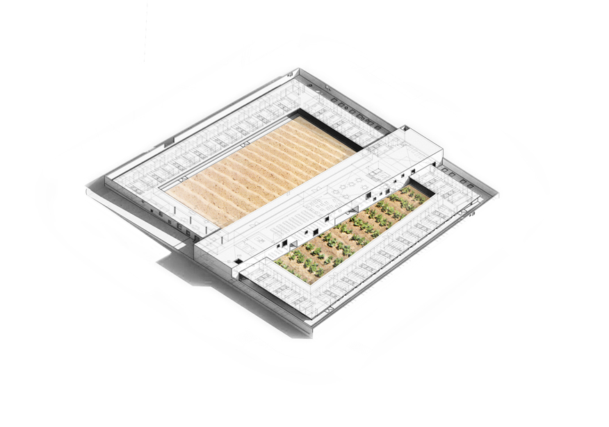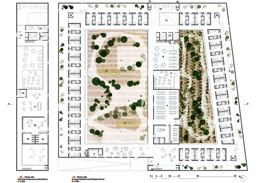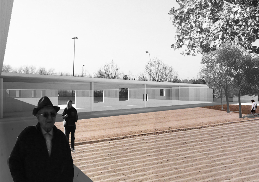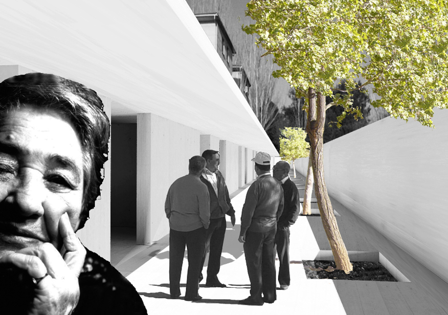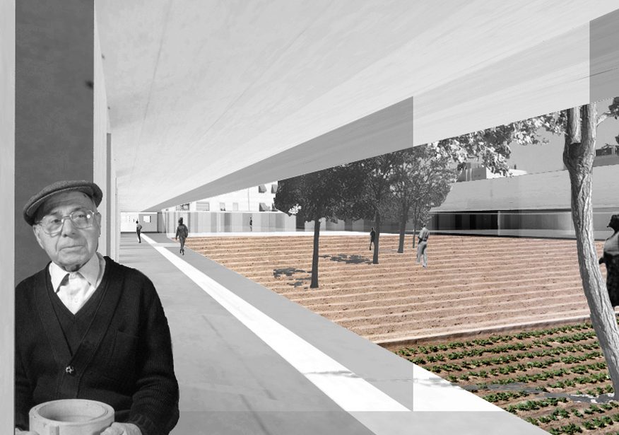 En un entorno poco atractivo de la periferia Granadina se plantea un centro social para la tercera edad con viviendas. La estrategia parte de la creación de una serie de huertos encerrados entre tapias. Se disponen dos patios de diferente carácter, uno destinado a la rehabilitación y el ejercicio, un huerto aromático, y otro destinado a la convivencia y el ocio, un huerto de hortalizas. Ambos huertos son autogestionados por los residentes, convirtiendose en espacios de intercambio, no solo entre los residentes sino también con gente del barrio que puede acudir a obtener productos. La relación física con el exterior, con la ciudad cercana, se limita a algunas visiones puntuales y enmarcadas. Dependiendo de la estación del año se albergan diferentes usos que ligarán el centro a su entorno. El volúmen que separa dichos huertos vuelca usos a ambos lados para su realización al aire libre, disponiendose habitaciones temporales en el perímetro del muro que encierra los huertos.