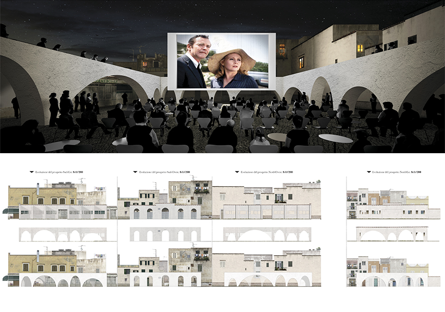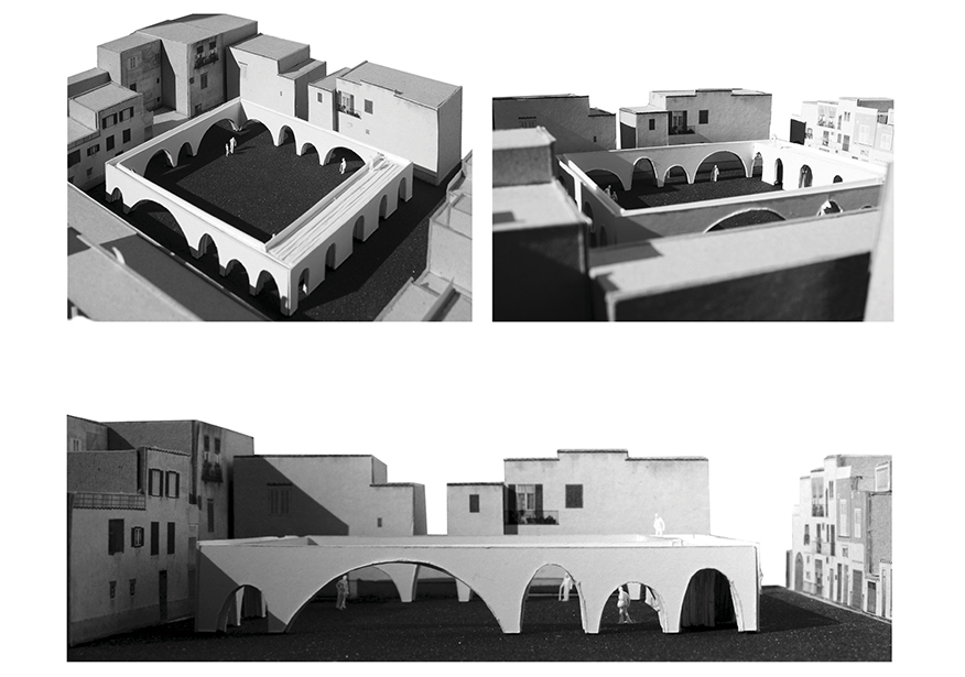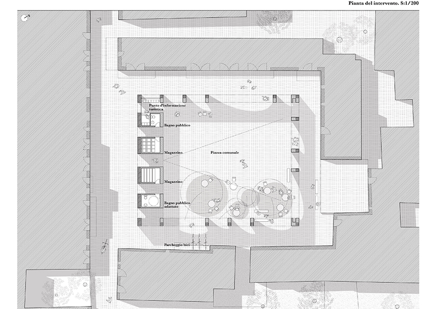 De esta forma, los trabajos de recuperación del ex mercato comunale se llevan a cabo sustrayendo material hasta constituir las nuevas arcadas, de-construyendo más que construyendo, de forma que el gasto en materiales es mínimo, invirtiendo casi la totalidad del presupuesto en mano de obra local. Los nuevos pórticos, realizados a partir de la estructura preexistente, funcionan como un espacio de transición entre la calle y la plaza, en un gradiente de privacidad muy típico en las plazas italianas y sus loggie.