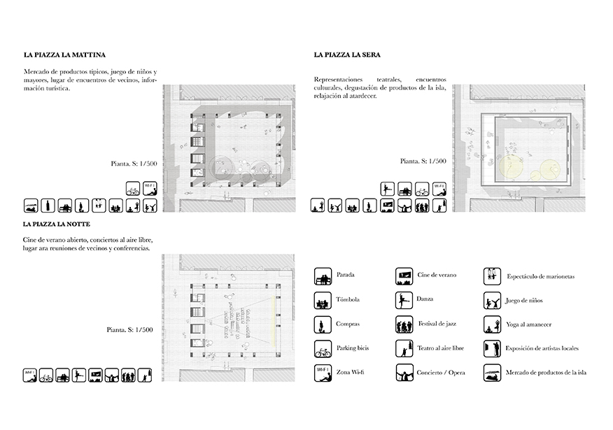 A través de la colocación de sencillos accesorios, las áreas destinadas a almacenamiento de sillas o stands, la plaza quedará equipada albergar todo tipo de actividades. Se prevé que durante todo el año, y no solo en temporada alta, se realicen actividades culturales y de ocio para los visitantes y vecinos: cine de verano, exposiciones de arte, mercado de productos típicos, recitales o teatros, siendo un lugar óptimo por su proximidad a la playa y a los puntos de interés. Además serviría de equipamiento para la ciudad, siendo por ejemplo un lugar de reunión para la tercera edad, donde poder jugar a la tómbola o a las cartas, un lugar para hacer talleres de marionetas para niños y funciones de magia, donde los jóvenes artistas podrían exponer sus creaciones, donde realizar clases de yoga al aire libre, etc…