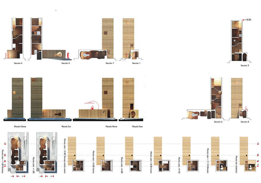 Por un lado se atiende a la escala lejana, el paisaje generado con las distintas posiciones de la espiral en un recorrido ascendente: LA TORRE. Se ponen en contacto las diversas actividades que alberga el pabellón-torre con distintas vistas lejanas.