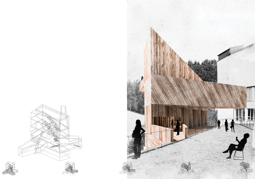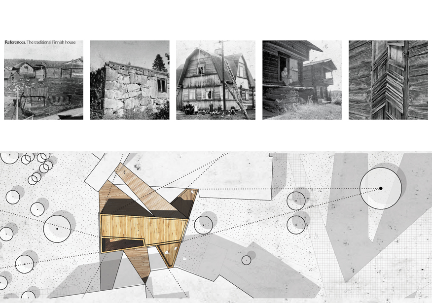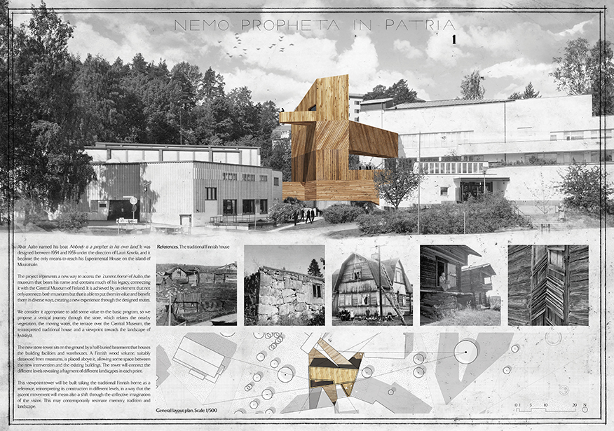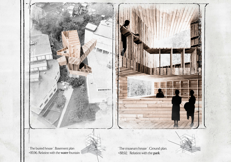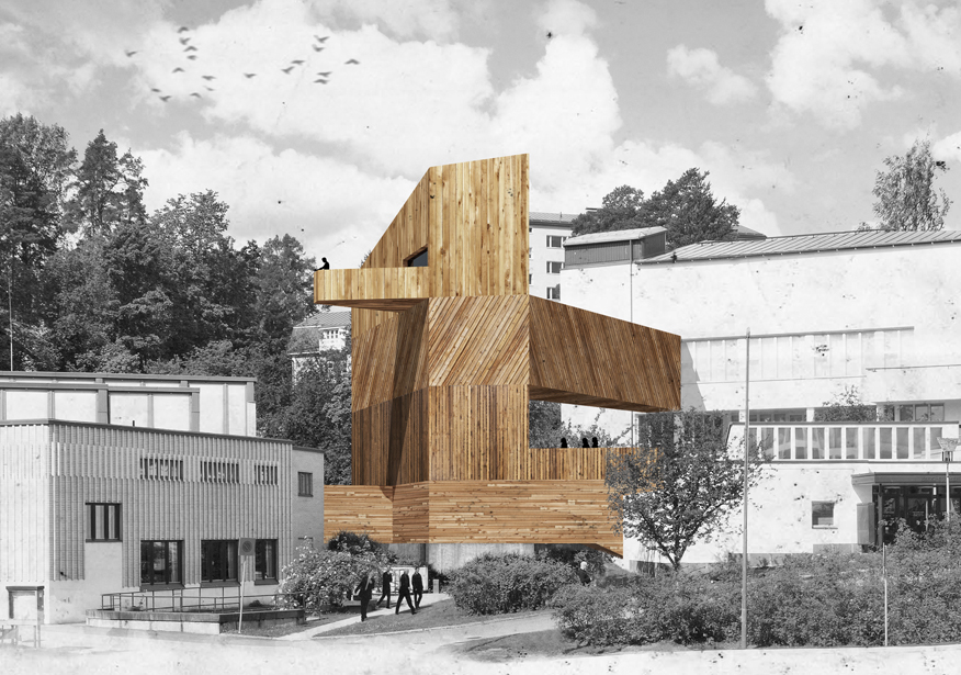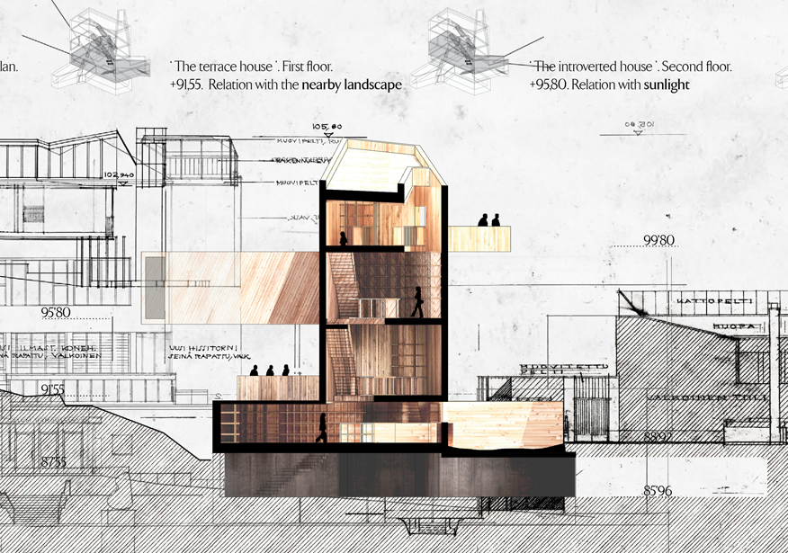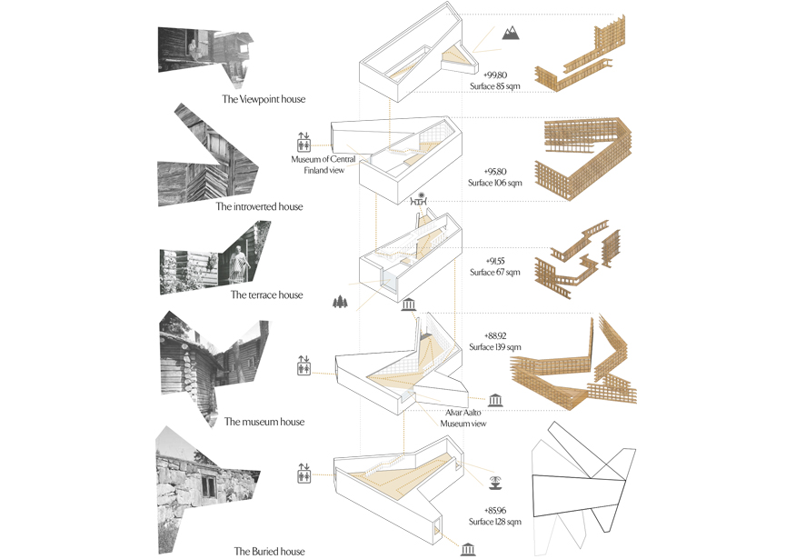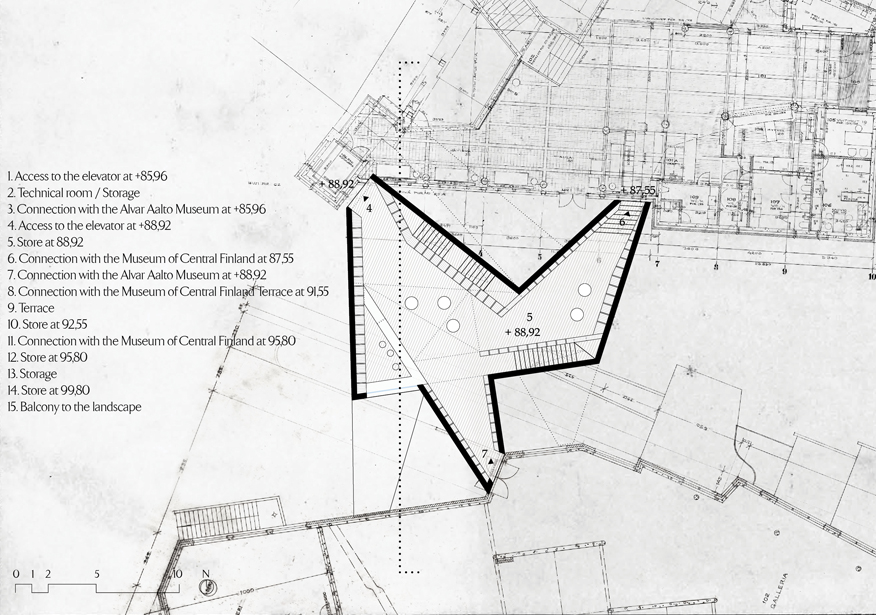 El proyecto supone una nueva forma de acceder a la ‘actual casa’ de Aalto, el museo que lleva su nombre y contiene gran parte de su legado, conectándolo con el Museo Central de Finlandia. Se plantea un elemento que no solo conecte ambos museos sino que los potencie y beneficie, generando una nueva experiencia a través del recorrido. Consideramos que es apropiado aportar un valor añadido al programa de necesidades, de manera que proponemos un viaje vertical, a través de la tienda, que pone en relación la vegetación cercana, el agua en movimiento, la terraza sobre el Museo Central, la casa tradicional reinterpretada y un mirador hacia el paisaje de Jyväskylä.