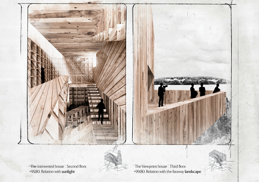 La nueva torre-tienda se asienta en el terreno mediante un basamento semienterrado que aloja las instalaciones y almacenes. Sobre éste se dispone un volumen de madera finlandesa convenientemente distanciado de los museos, dejando aire entre la nueva intervención y los edificios preexistentes. La torre va conectando los diferentes niveles dejando ver en cada caso un fragmento de paisaje diferente. Construiremos esta torre-mirador tomando como punto de partida la casa tradicional finlandesa, reinterpretando su construcción en diferentes niveles, de manera que el ascenso por la misma supondrá también un desplazamiento a través del imaginario colectivo del visitante. De este modo podrán entrar en resonancia la memoria, la tradición y el paisaje de un modo contemporáneo.