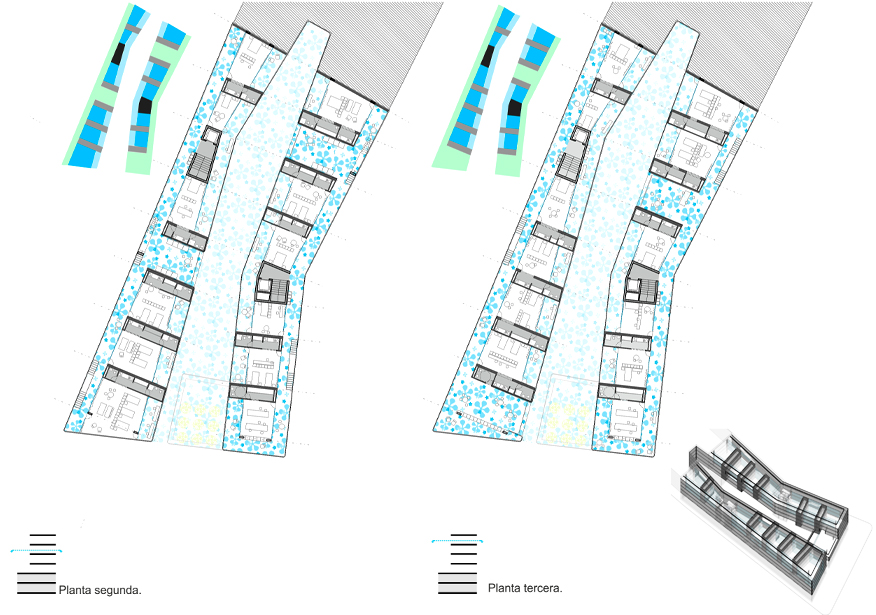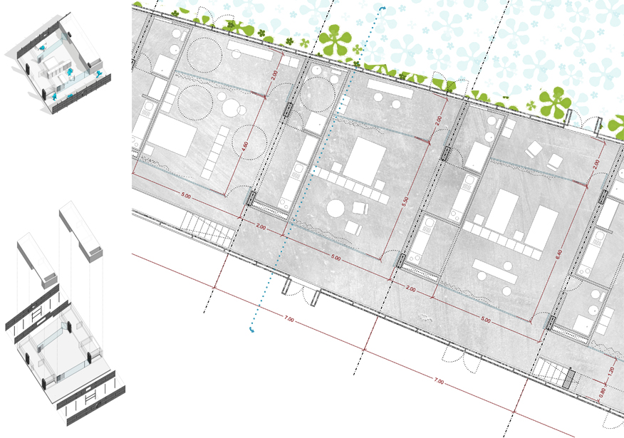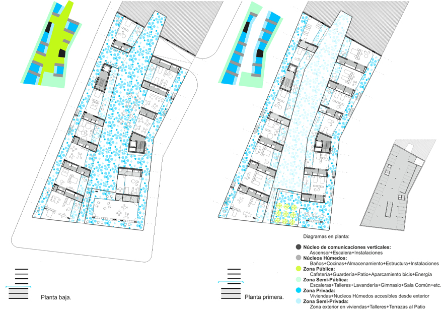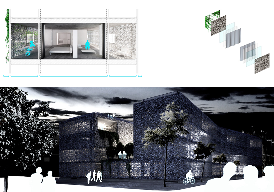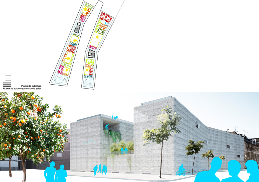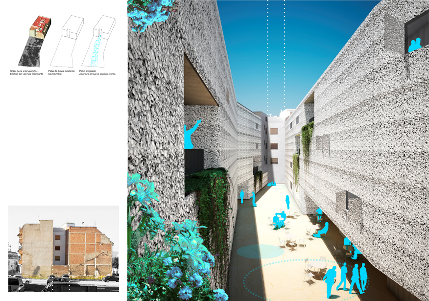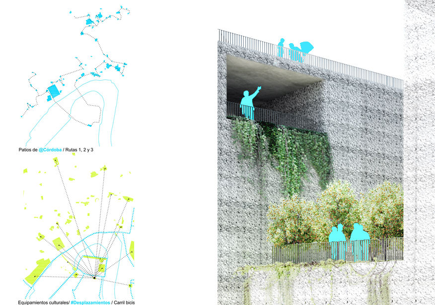 Frente a confinar este patio entre cuatro paredes, proponemos la situación opuesta. La nueva capa de arquitectura lo recogerá y ampliará, haciendo participes a los vecinos de una nueva situación más optimista que la que sin duda esperaban. Las intenciones tras la creación de este NUEVO PATIO AMPLIADO no solo suponen un cambio en el ámbito morfológico de la parcela, si no que pretenden un cambio en otras capas paralelas para enriquecer el lugar. Ingresando en la red de patios existentes en Córdoba, perteneciendo así a su red de eventos anuales y habilitando circuitos culturales, de ocio y de trabajo, planteamos una serie de despazamientos de actividades en el entorno, en un juego de intercambios entre otros patios de la ciudad, el barrio, el C4 y cualquier otro punto que vaya incorporándose este proceso. El resultado será un centro de Vivienda, Trabajo y Ocio, con el patio ampliado como centro de las relaciones y de la vida en común de los habitantes.