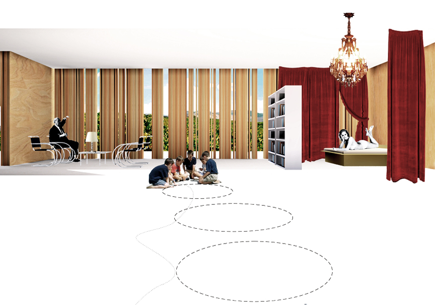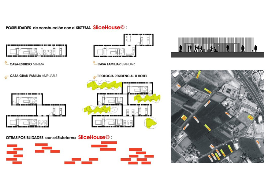 Una casa no deja de ser la conjunción bien definida de dos núcleos, la cocina y el baño, y unas actividades que se suceden alrededor de éstos. En este sentido se piensan las viviendas con una sección variable que va desde los 35O cm a los 4OO cm de alto y ancho, y un fondo de dimensiones ampliables, dependiendo del número de costillas que se obtengan. Se propone un catálogo de ‘costillas’ ámplio de manera que de la combinación de las mismas se pueden obtener muy diversas configuraciones de viviendas.
