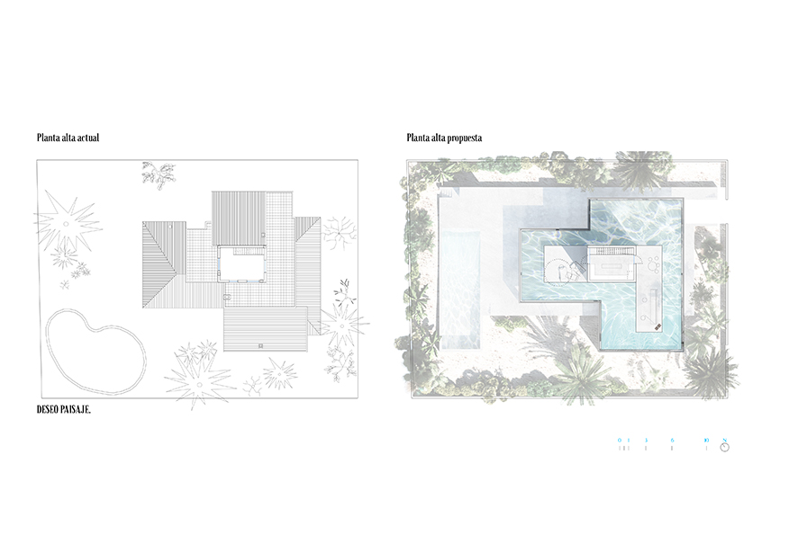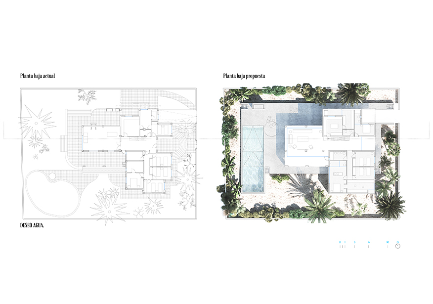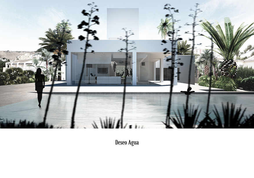 ¡Agua!. Para cumplir este deseo se suprimirán todos los caminos y la piscina existente. Se plantea una nueva plataforma elevada al nivel de la casa, quedando la nueva piscina en contacto con el interior y participando mucho más de los espacios comunes y las vistas. Se disponen unos nuevos accesos integrados en la nueva plataforma. El jardín se tratará como un único elemento, de forma que sea continuo en torno a la casa y así se perciba desde su interior