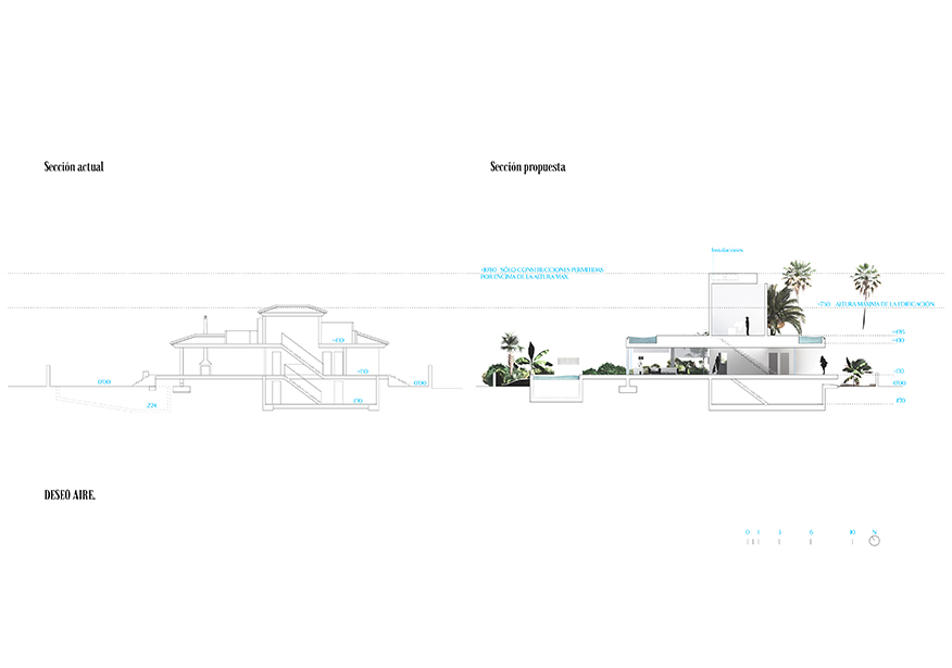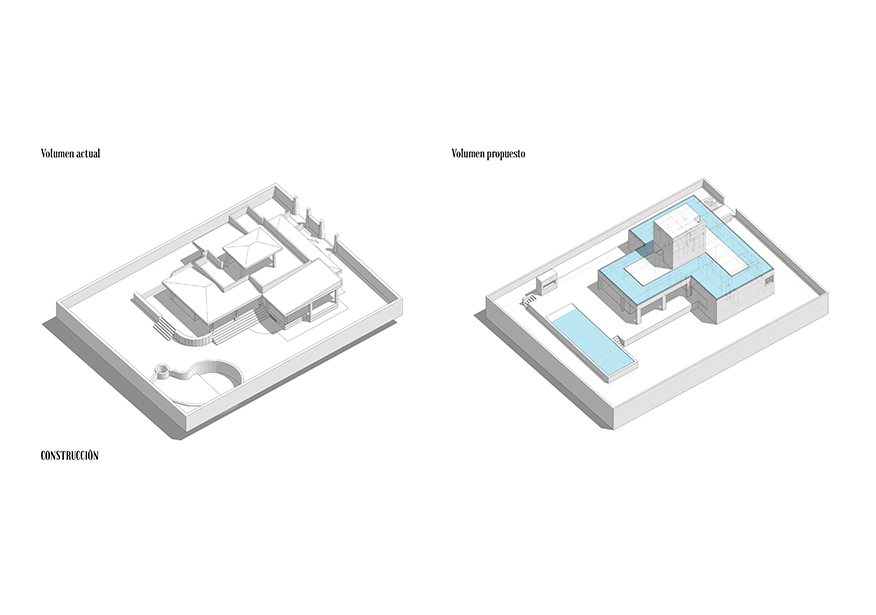 Se trata de una intervención mínima para las cualidades que se pueden llegar a conseguir. No se modifica la estructura actual, simplemente se elimina superficie de cerramiento en algunas zonas y se amplía en otras. Siendo mucho mayor la superficie a eliminar que la nueva. El cuerpo de escaleras se eleva hasta la máxima altura permitida para poder albergar las instalaciones en su cubierta quedando así fuera de la vista y creando un espacio de cocina auxiliar en contacto con la terraza-mirador. Las cubiertas de teja son sustituídas por una cubierta inundada de poca profundidad, de manera que el peso no plantea un problema a la actual estructura sobredimensionada. Para la adecuación del jardín se amplía la plataforma al nivel de la casa para albergar la nueva piscina, siendo la excavación necesaria mínima, puesto que aprovecha parte del hueco de la piscina anterior y el esto se realiza sobre rasante. Creemos bastante adecuado afrontar la actuación de una única vez para poder ir realizando trabajos de manera simultánea y obtener así un resultado más satisfactorio.