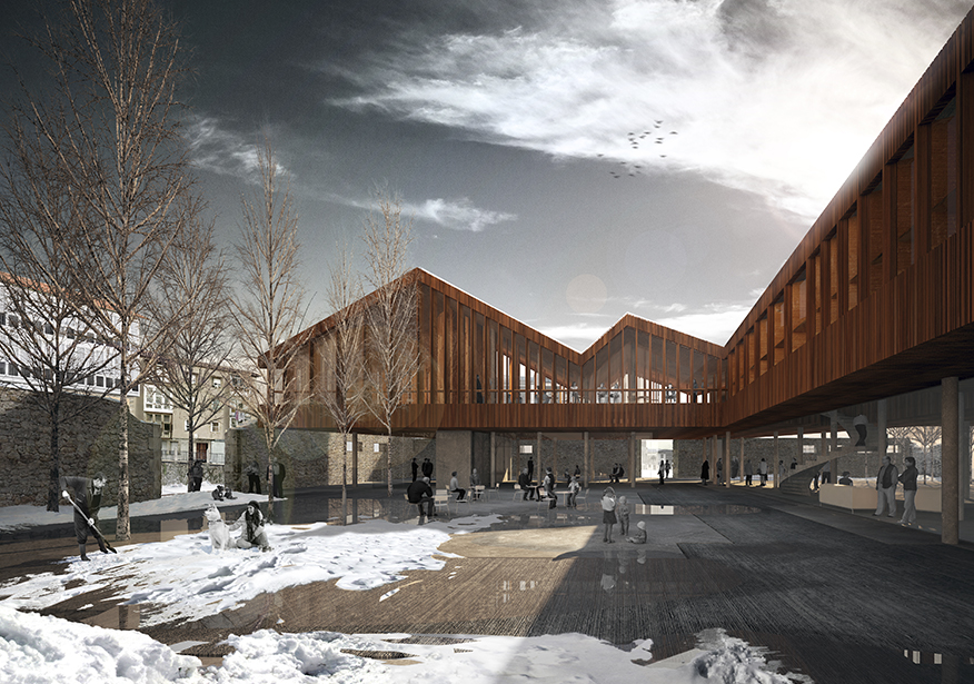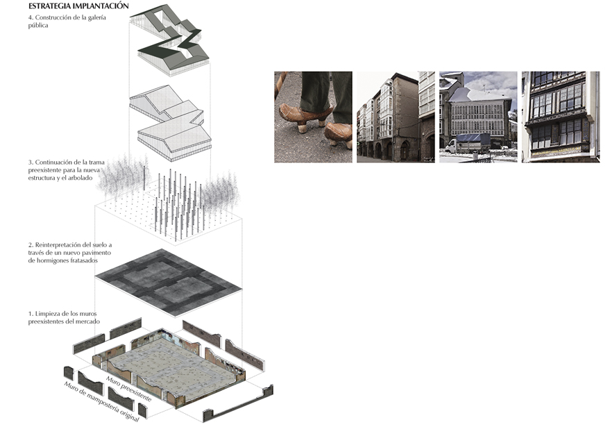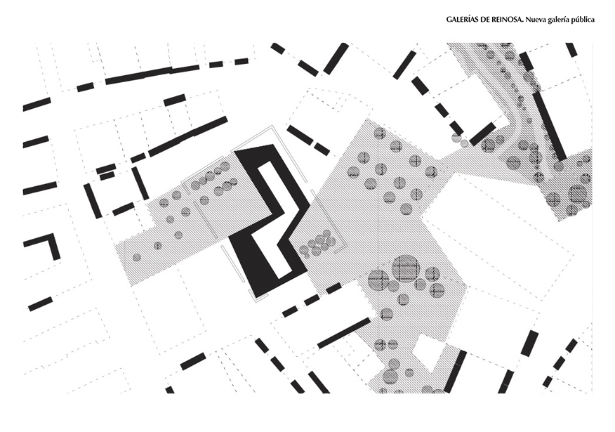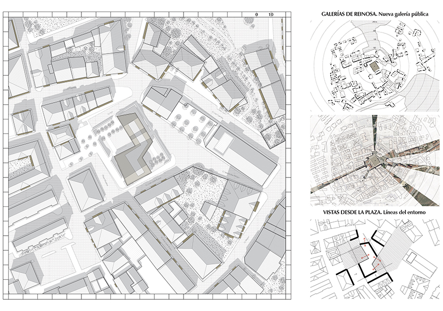 El edificio dialoga y responde con su forma a la trama urbana del lugar. Supone una continuidad de la misma, planteando una morfología en lógica relación con los edificios vecinos y los vacíos encontrados. Existen dos realidades en contacto y el proyecto trata de atender por un lado en planta baja a los muros del antiguo mercado y en planta alta a los edificios que conforman la plaza, creando las nuevas fachadas a partir de lo existente. Se trata de construir lo nuevo a partir de los elementos ya pertenecientes a Reinosa, no sólo con los actuales sino también con los vestigios recuperados.