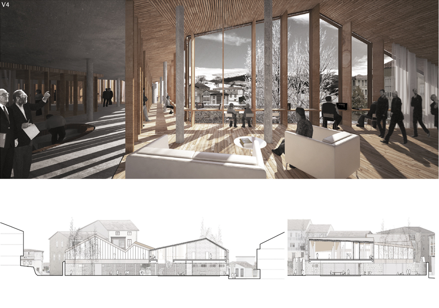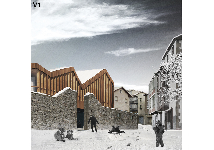 La galería de las casas de Reinosa es el elemento más identificativo de la imagen del municipio. Define el límite entre la calle y el ámbito de la casa, sirviendo como filtro, colchón climático y lugar de estancia. El proyecto propone desplazar este elemento del ámbito doméstico al público para crear un espacio reconocible por los habitantes. De esta forma todos compartirán una segunda vivienda y estar en el centro sociocultural será ‘como estar en casa’.