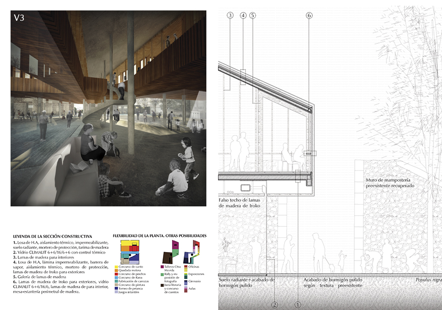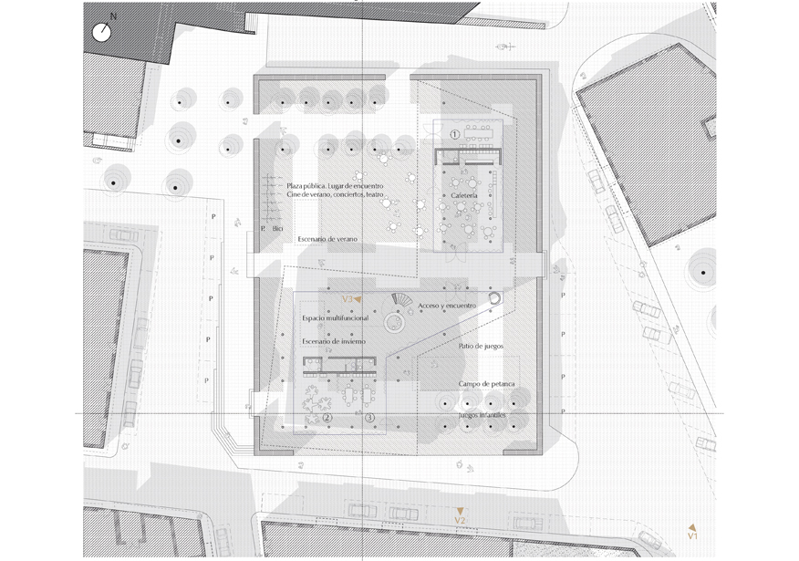 Se ha optado por conservar en pie los muros perimetrales, desnudándolos para mostrar su sistema constructivo, que se asemeja a algunos de los muros de mampostería del entorno. La estructura del nuevo edificio y la vegetación se plantean siguiendo la trama de pilares que sostenía la cubierta del mercado, reconstruyéndola en parte en un ejercicio de memoria. El plano del suelo es reinterpretado a través de dos texturas de hormigón fratasado que reproducen el dibujo del suelo original. De esta forma el vecino de Reinosa podrá leer en él y recordar el espacio que desapareció en contraste con la nueva ‘Casa para todos’.