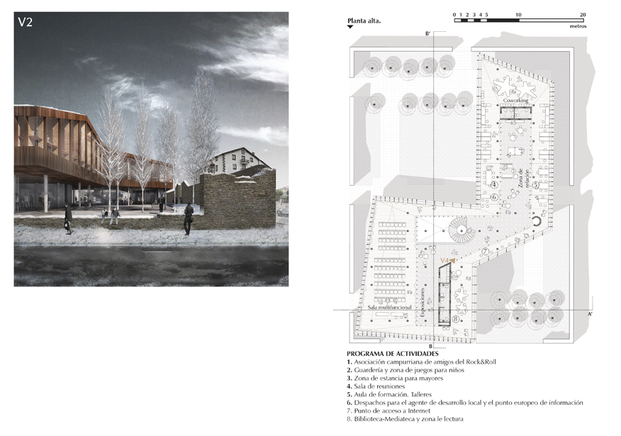 Esta nueva casa se configura a partir de la galería, que, al ser pública, cambia de escala para envolver el edificio y acoger a todas las familias del pueblo de manera que se pueda crear una comunidad culturalmente conectada y activa, mezclando diferentes generaciones.