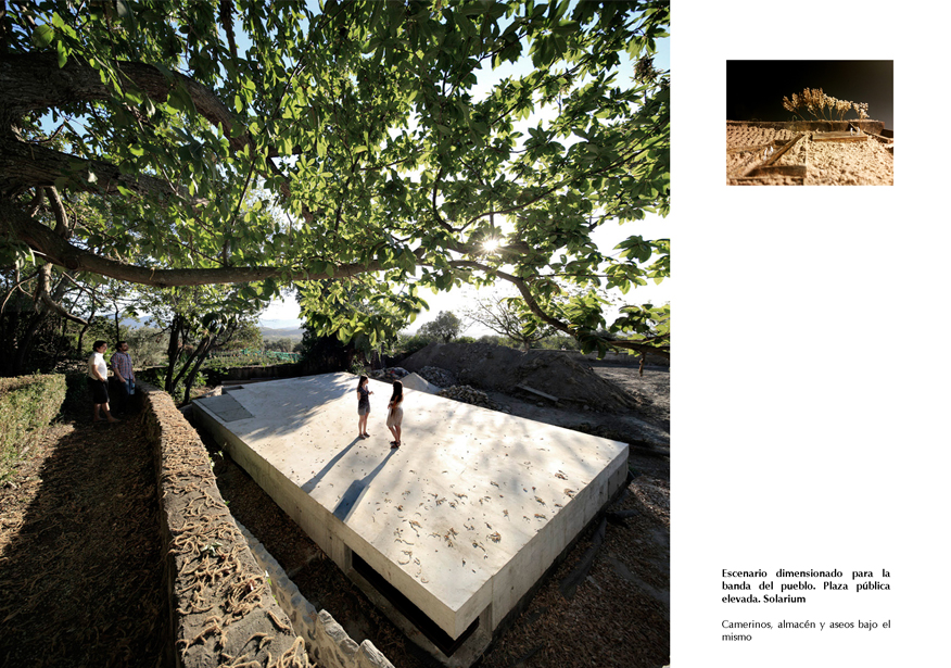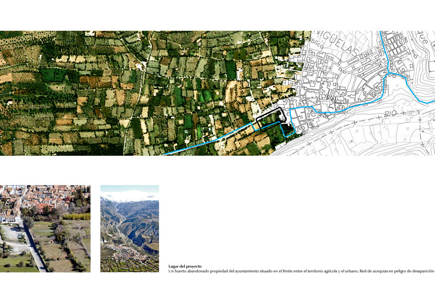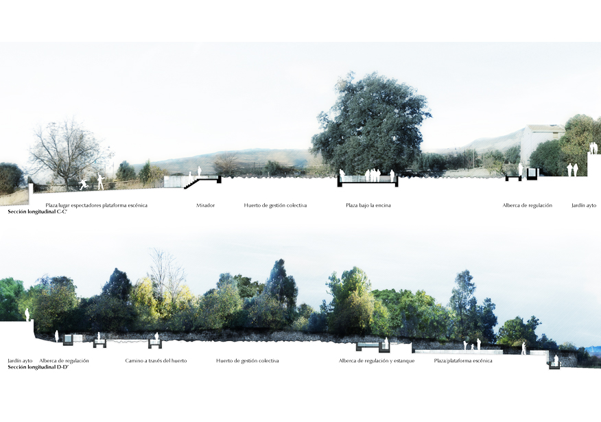 Se propone la puesta en valor y en uso de un huerto abandonado que ha permanecido intacto en el límite del núcleo urbano y los cultivos agrícolas, haciendo un ejercicio de memoria y ofreciendo al pueblo un nuevo espacio público: un huerto de gestión colectiva, un parque y un espacio escénico usado como cine de verano, escenario para actuaciones y conciertos y plataforma para la conocida banda del pueblo.