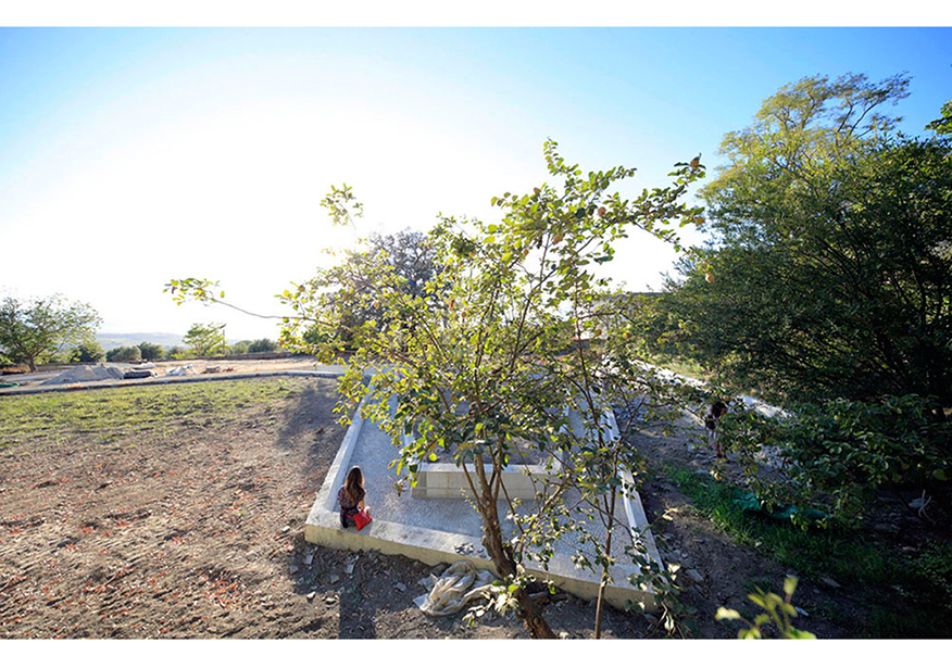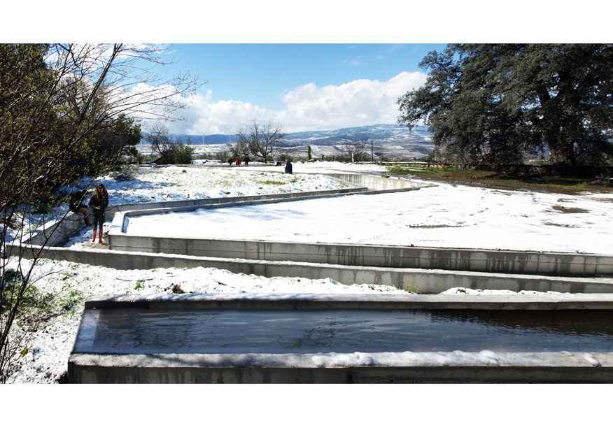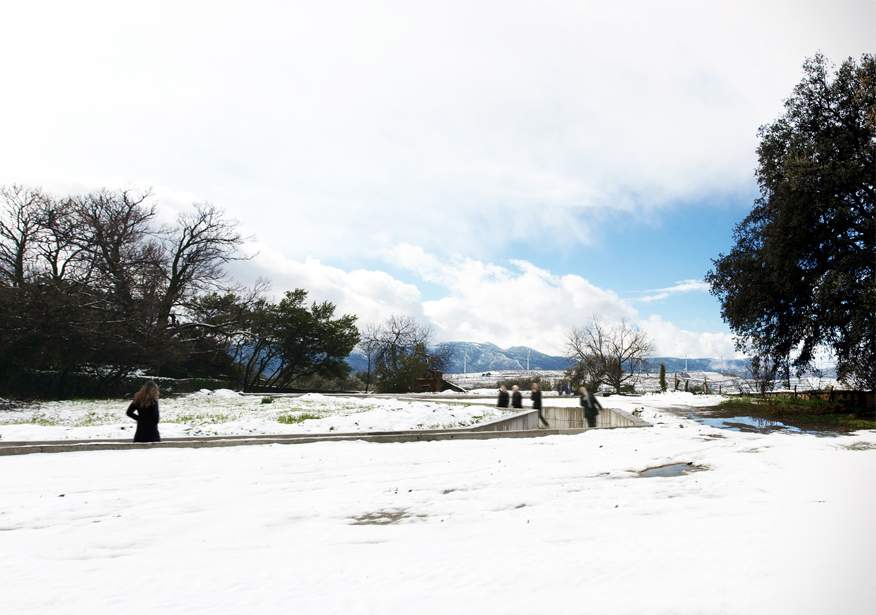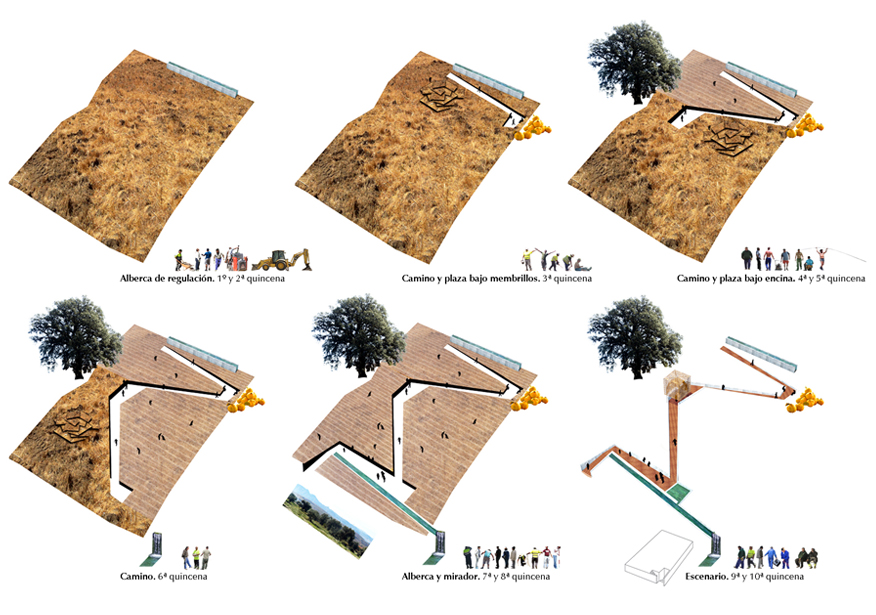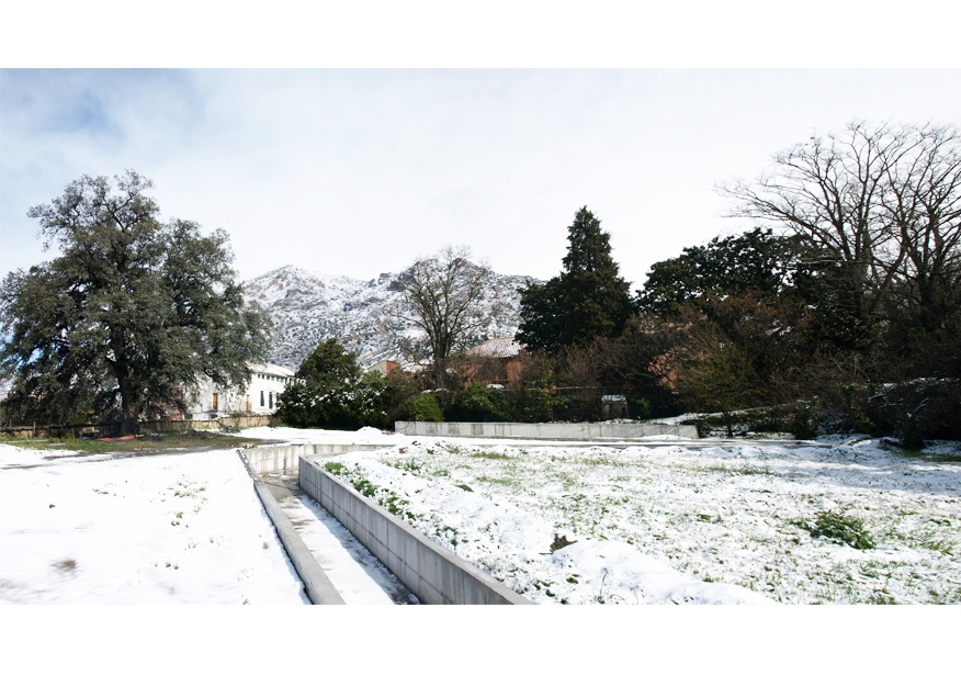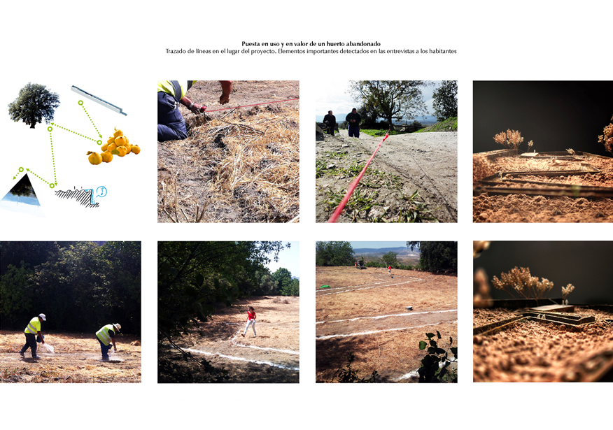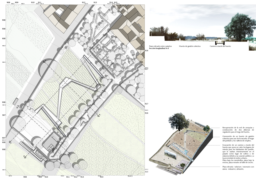 La intervención pretende recuperar estas memorias utilizando y poniendo en valor los elementos preexistentes. Un camino excavado en el huerto, uniendo los puntos estratégicos detectados hace posible entender el lugar, el olor de los membrillos, la sombra de la encina, las vistas de valle y el sonido del agua, que es acumulada en dos albercas para el riego del nuevo huerto, gestionado por talleres de empleo, los niños del colegio o los jubilados del pueblo.