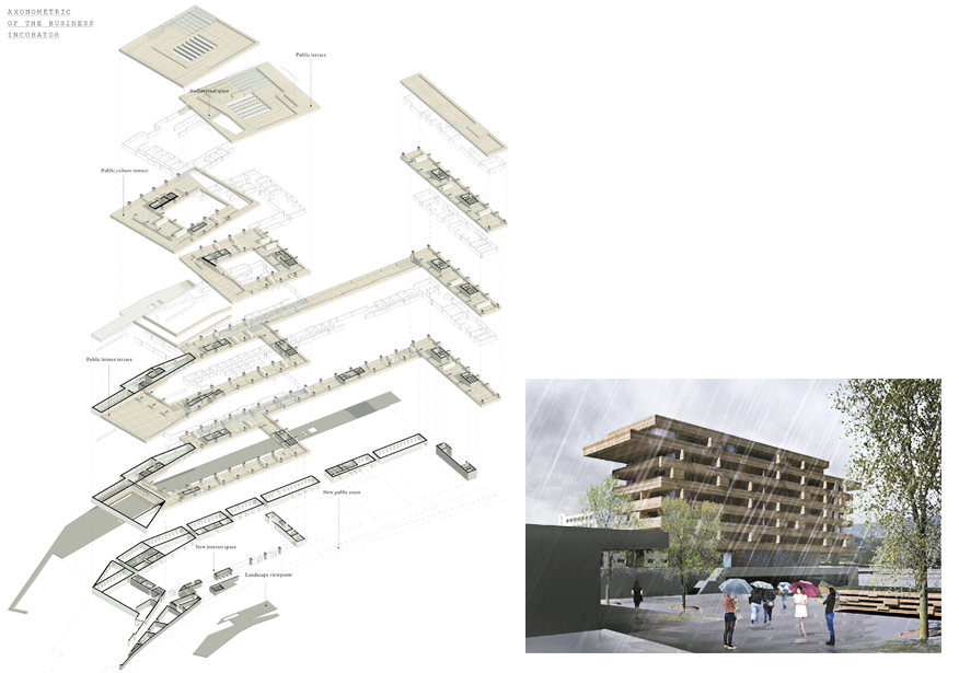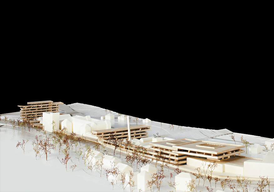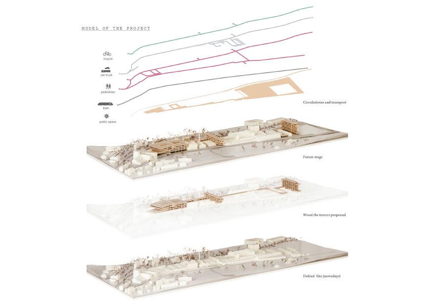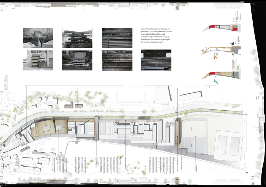 De esta forma, el «laberinto de naves» industriales se ofrece como un paisaje a transformar según lógicas de reutilización y demolición selectiva. Estas lógicas implican el reciclaje de materiales pero, sobre todo, de las estrategias de apilamiento de la madera y la piedra de la cultura local, así como el vertido del asfalto, indicándonos cómo actuar en cada sitio. Ahondando aún más en esta idea, proponemos la posibilidad de generar un sistema constructivo contemporáneo y genuino de la región, un sistema que pueda producirse en colaboración entre arquitectos y talleres artesanales avanzados, artistas y empresarios, algunos de ellos insertados en la nueva área de empresas emprendedoras. Las lógicas constructivas del apilamiento se ofrecen como un recurso intelectual intuitivo que vincula tradición y arquitectura contemporánea; un modo de construir el futuro de la región a partir de la innovación constructiva. La arquitectura de «la nueva Dubied» quedaría así entrelazada con el bosque y la montaña, con la sierra de talado y con la cantera, con los almacenes de madera y de piedra. Se trata de la misma red que produciría intercambios entre distintas profesiones pero, además, enlazaría productores y consumidores, trabajadores . El paisaje resultante terminaría tejiendo al final una red de recursos bio-culturales extraídos desde el sitio específico.