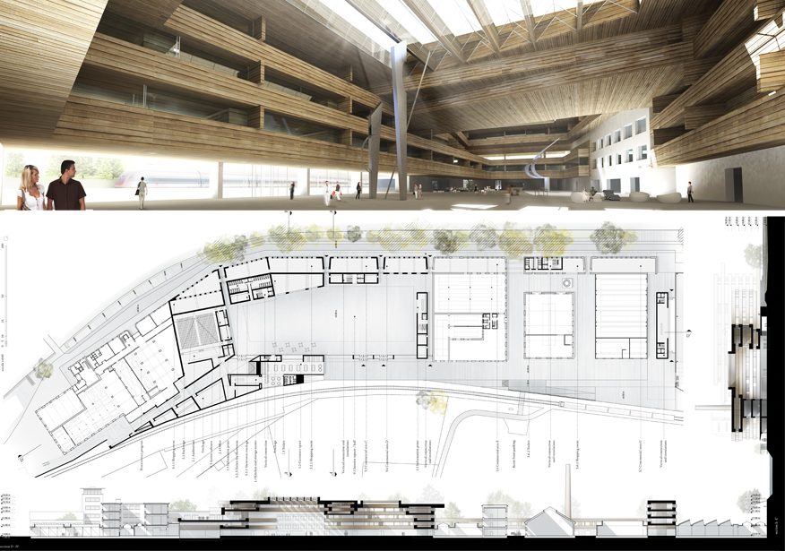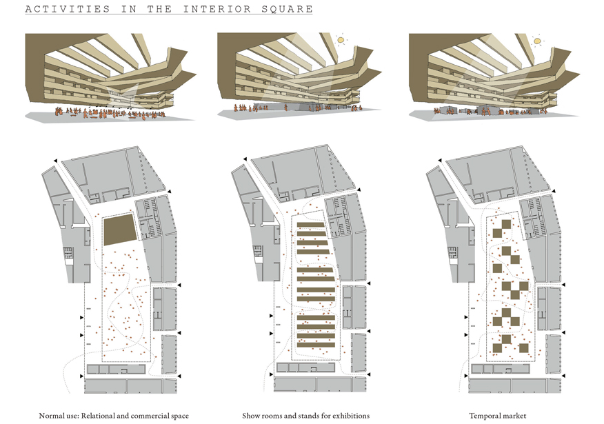 La nueva arquitectura de madera se inserta cuidadosamente, «redibujando» los límites del conjunto edificado. Se trata de una arquitectura de borde que va enlazando fragmentos y va estableciendo relaciones distintas en función de lo que se encuentra; a veces se enrolla sobre sí misma para albergar un espacio público, a veces se adosa a los bordes comerciales, otras veces se convierte en pérgola…. El objetivo primordial es producir conexiones, espacios de intercambio y de comunicación.